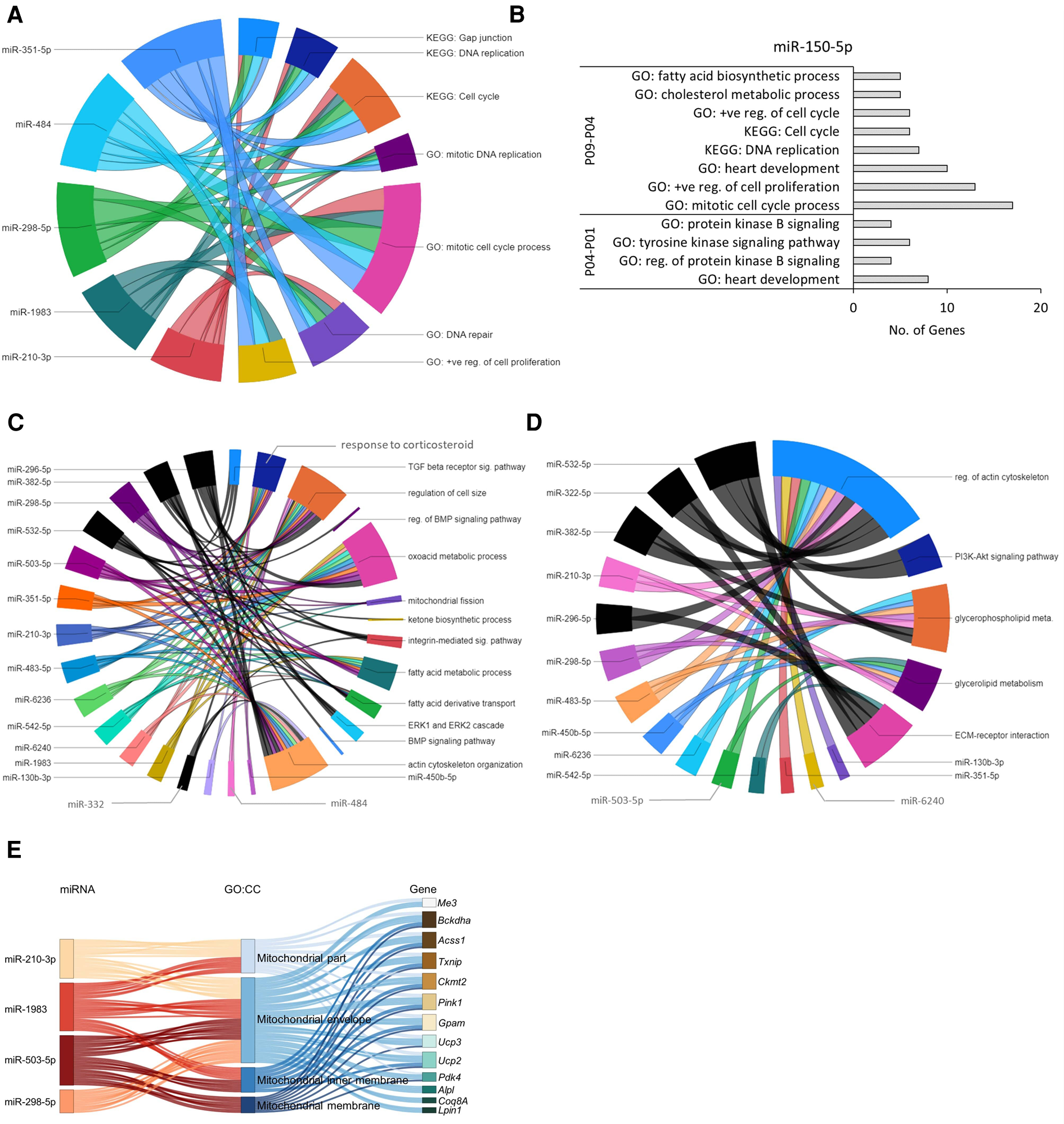 Predicted miRNA-gene regulatory networks in mouse hearts within the first 9 postnatal days. (A) Chord diagram showing that target genes of early downregulated miRNAs (P04–P01) were enriched in GO:BP and KEGG pathways (p ≤ 0.05) associated with cell cycle and proliferation. (B) The upregulated miR-150-5p showed negative regulatory effect on GO biological processes and KEGG pathways (p ≤ 0.05) related to cell cycle and proliferation in P01 to P09 time span. (C,D) Chord diagram demonstrating interaction network between enriched biological processes (C) and KEGG pathways (D) with downregulated miRNAs identified in P09–P04 and P09–P01 comparisons. The enrichment of the target genes of each miRNA with the GO biological processes and KEGG pathways (p ≤ 0.05) are presented with a single color. Gene-regulatory networks of miRNAs from P09–P01 comparison are shown in black color. The size of the section representing each GO term or KEGG pathway is proportional to the number of target genes associated with the corresponding GO term or KEGG pathway. (E) Sankey plot showing mitochondria-associated GO:CC enriched in verified target genes of downregulated miRNAs in the P09–P04 comparison.