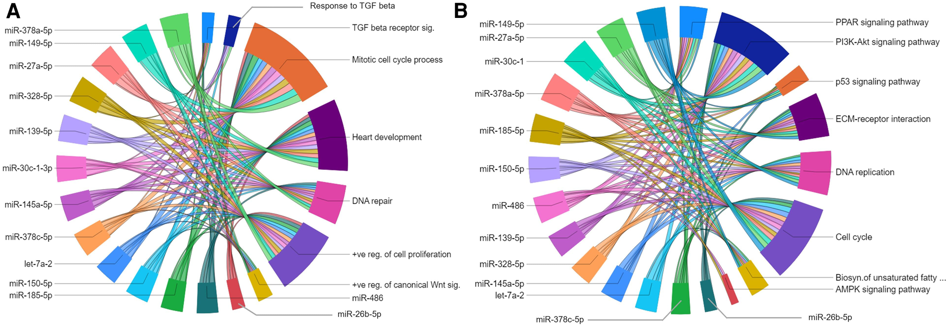 Gene regulatory networks of upregulated miRNAs after postnatal day 9. Chord diagrams showing negative regulation of GO biological processes (A) and KEGG pathways (B) by target genes of upregulated miRNAs. The enrichment of the target genes of each miRNA with the GO biological processes and KEGG pathways (p ≤ 0.05) are presented with a single color in the chord diagrams. The size of the section representing each GO term or KEGG pathway is proportional to the number of target genes associated with the corresponding GO term or KEGG pathway.