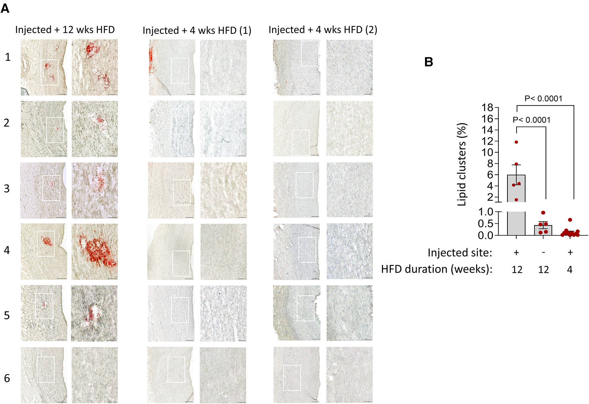 Detection of lipid clusters at the injury sites in the tunica media under prolonged hyperlipidemia. (A) Aortic tissue cross-sections from each injection site (n = 6) in the indicated groups, stained with ORO and counterstained with haematoxylin. The magnified fields of view detect lipid clusters (red) in 5 out of 6 injected sites within tunica media in prolonged HFD group. No lipid clusters are seen in all 6 injection sites in both pigs under short-term 4 weeks HFD. Adventitial ORO-positive staining in random areas was not considered injury-related. Scale bars: 100 µm. (B) Bar charts show the quantification of the area positive for lipid clusters (mean ± SEM, n = 5 injected sites out of 6, ****p < 0.0001 by one-way ANOVA test).