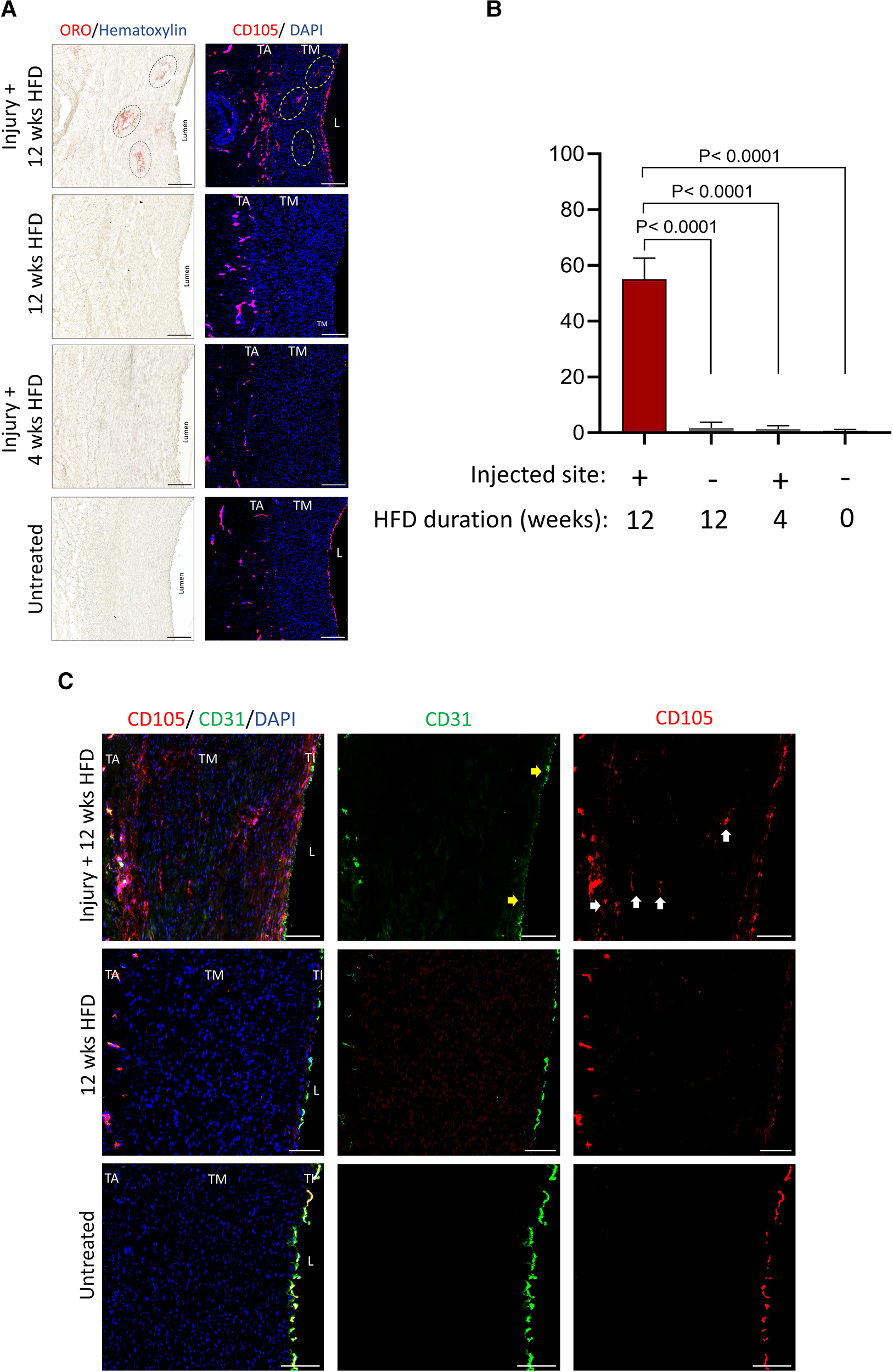 Presence of VV at the injury sites in the tunica media under prolonged hyperlipidemia. (A) Corresponding aortic tissue sections positive for lipid clusters (described in Figure 3A) were stained by immunofluorescence for detecting VV (CD105, red), and nuclei DAPI (blue). Scale bar: 100 µm. (B) Bar graphs show quantification of the area positive for VV in the indicated groups (mean ± SEM, n = 3, ****p < 0.0001 by one-way ANOVA test). (C) Tissues as shown in (A) were stained for VV (CD105, red) and mature endothelia (CD31, green). Representative micrographs are shown. Arrows: areas positive for VV, lacking the expression of CD31, a marker for mature endothelia. TA, tunica adventitia; TM, tunica media; TI, tunica intima; L, lumen. Scale bar: 100 µm.