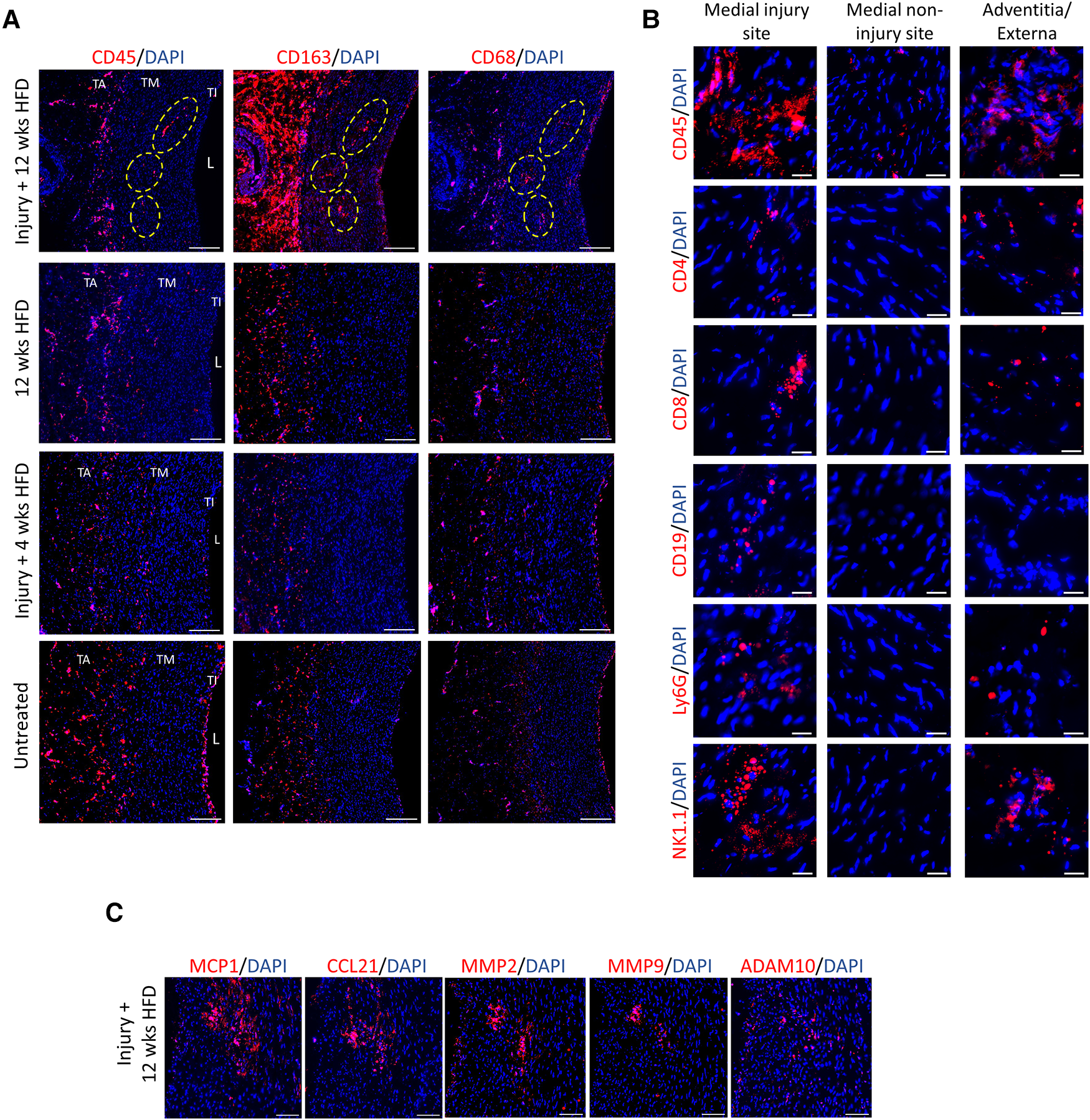 Presence of inflammation and immune cells at the injury sites in the tunica media under prolonged hyperlipidemia. (A) Corresponding aorta tissue sections positive for lipid clusters and VV (described in Figure 3A) were stained with markers of immune cells and inflammation, CD45, CD163, and CD68 (red). TA, tunica adventitia; TM, tunica media; TI, tunica intima; L, lumen. Scale bar: 100 µm. (B) Arterial tissues at indicated sites show the detection of immune cell markers, including CD45, CD4 and CD8 T cells, CD19 (B cells), Ly6G (granulocytes/neutrophils) and NK1.1 (NK cells). Scale bar: 20 µm. (C) Corresponding injected sites under hyperlipidemic condition were stained for detection of chemokines (MCP1, CCL21) and metalloproteinase markers (MMP2, MMP9 and, ADAM10). Nuclei DAPI (blue). Scale bar: 100 µm.