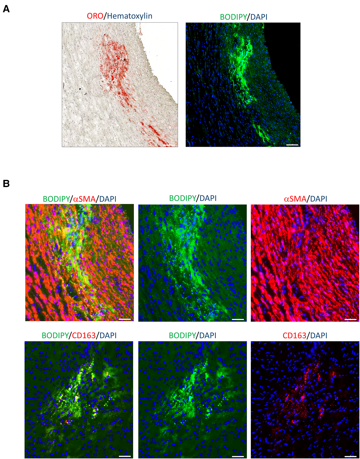Lipid clusters localised mainly in vSMCs. (A) Comparison of lipid cluster distribution at the injured site by ORO staining and lipophilic fluorescent probe, BODIPYTM 493/503 (green). Nuclei DAPI (blue). Scale bar: 100 µm. (B) Co-staining analysis of the indicated tissue section with BODIPYTM 493/503 and αSMA or CD163 (red). Images indicate all markers and individual channel. Scale bar: 50 μm.