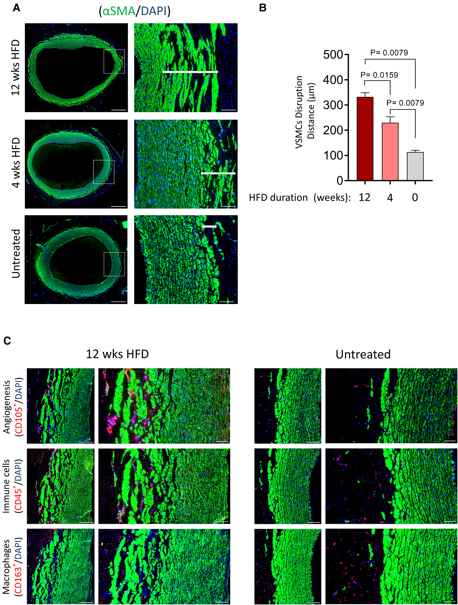 Figure 7A shows transverse tissue sections of tunica media primarily composed of vSMCs, identified by αSMA expression. As indicated at higher magnification (Figure 7A, right panel), hyperlipidemia triggered disruption of vSMCs around the outer layer of tunica media towards the tunica adventitia. The vSMC compartment adjacent to the tunica intima remained intact. We measured the width of vSMC misalignment, and our data showed significantly wider disruption in the outer layer of the tunica media towards the tunica adventitia in response to prolonged and short-term hyperlipidemia (Figure 7B). A co-staining analysis detecting VV (CD105+) and immune cell infiltrates (CD45+ and CD163+) revealed invasion of micro-vessels and immune cells through the adventitia-media interface within the misaligned vSMCs (Figure 7C).