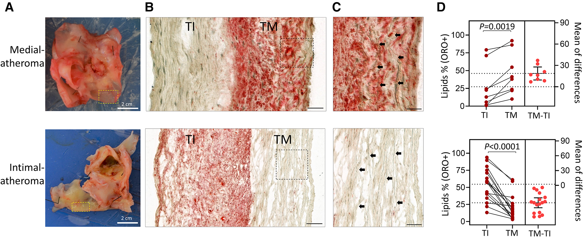 Identification of patients’ post-CEA with elevated atheroma in the tunica media compared to the tunica intima. (A) Photographic images of arterial specimens obtained from patients post-CEA. Selected regions representing early-stage disease without plaques were compared for lipid content (ORO+). (B) Micrographs show lipid deposition (ORO+) in tunica media (TM) or tunica intima (TI) in the indicated groups. (C) Magnified fields of view from (B) showing elastin fibers (black arrows) in the tunica media. Scale bars in B,C: 100 µm. (D) Estimation plots showing percentages of atheroma based on ORO+ staining in tunica intima (TI) compared to tunica media (TM). Data are shown for individual patients; n = 8 patients with greater atheroma in TM than in TI and n = 17 patients with atheroma higher in TI than in TM. (**p = 0.0019 and ****p < 0.0001 by paired Student's t-test). The right panel graphs show the mean difference between the compared groups and the 95% confidence intervals.