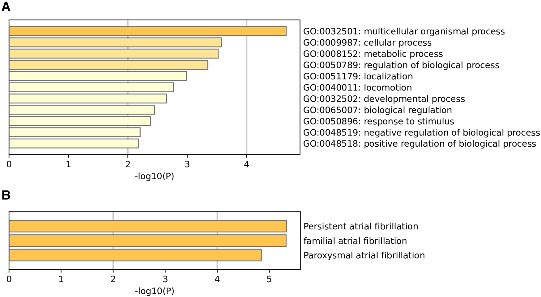 To functionally annotate the identified SNPs, we carried out GO enrichment analysis. The GO enrichment analysis suggested that the biological functions of these genes of 105 m6A-SNPs include multicellular organismal process (GO:0032501), cellular process (GO:0009987), metabolic process (GO:0008152), regulation of biological process (GO:0050789), localization (GO:0051179), locomotion (GO:0040011), developmental process (GO:0032502), biological regulation (GO:0065007), response to stimulus (GO:0050896), negative regulation of biological process (GO:0048519), positive regulation of biological process (GO:0048518) (Figure 3A). As for quality control and association analysis of 7 genes regulated by 7 m6A-SNPs with eQTL signals, the top few enriched clusters (persistent atrial fibrillation:C2585653, familial atrial fibrillation:C3468561, paroxysmal atrial fibrillation:C0235480) are shown in the Figure 3B.