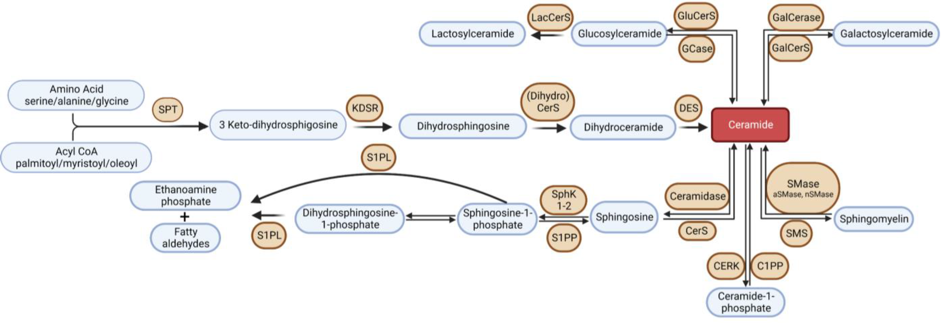 Overview of sphingolipid metabolism. SPT, serine palmitoyltransferase; KDSR, 3-keto-dihydrosphingosine reductase; DES, dihydroceramide desaturase; GCase, glucocerebrosidase; GluCerS; glucosylceramide synthase; LacCerS, lactosylceramide synthase; GalCerS, galactosylceramide synthase; SMase, sphingomyelinase; SMS, sphingomyelin synthase; CerS, ceramide synthase; C1PP, ceramide-1-phosphate phosphatase; CERK,; S1PP, sphingosine-1-phosphate phosphatase; SphK, sphingosine kinase; S1PL, sphingosine-1-phosphate lyase.