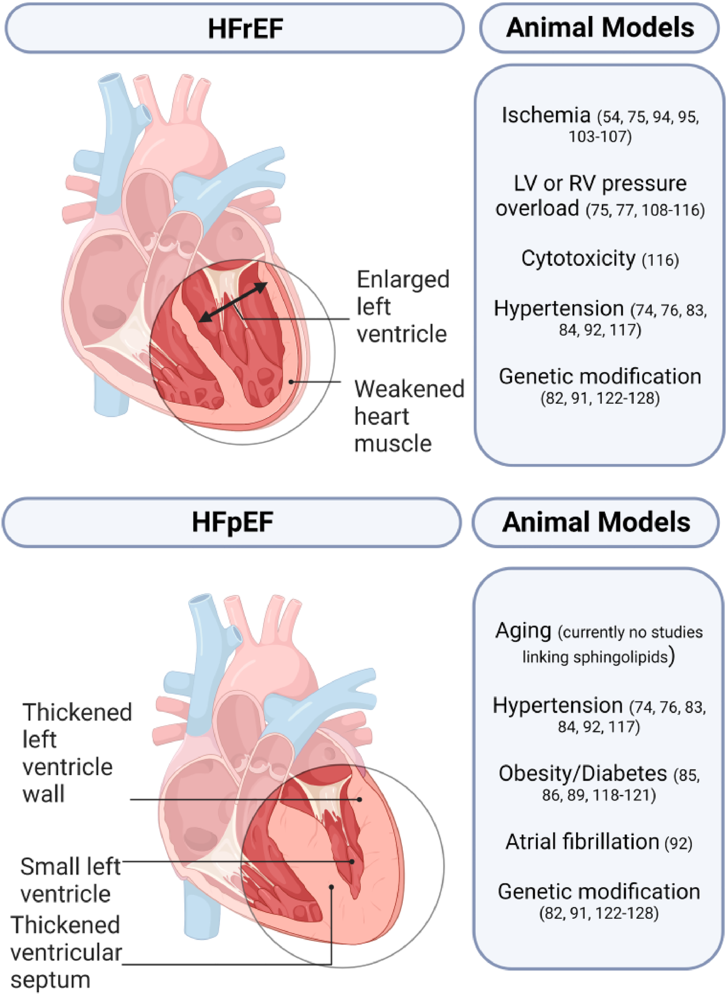 Heart failure (HF) is a debilitating medical condition where the heart is unable to meet the metabolic demands of the body. It is a widespread clinical syndrome affecting at least 64 million people globally, and this number is expected to rise (1, 2). HF poses a significant economic and clinical burden and dramatically impacts patients' quality of life (3). Different classifications of HF exist, with the most widely accepted based on the percentage of blood volume ejected by the left ventricle (LV) during systole, i.e., heart failure with reduced ejection fraction (HFrEF, LVEF ≤40%), heart failure with preserved ejection fraction (HFpEF, LVEF ≥50%), and as of 2016, heart failure with borderline/mildly reduced ejection fraction (HFbEF/HFmrEF, LVEF 41%–49%) (4–6). Though, there is some controversy related to the cut-off points in this HF classification. Currently, no human studies link HFbEF/HFmrEF with sphingolipids and will not be discussed further in this review.