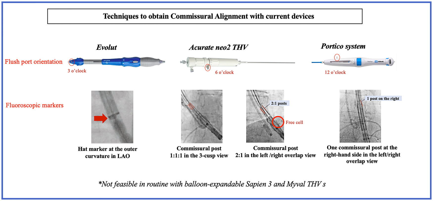 Techniques to obtain commissural alignment with current devices. LAO, left anterior oblique; THV, transcatheter heart valve.