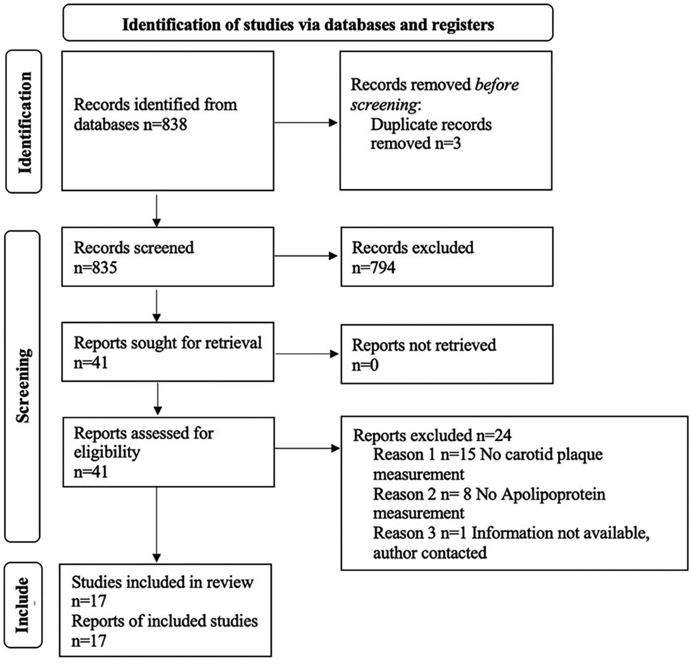 The search strategy yielded 838 records after removing duplicates (Figure 1). Forty-one full-text studies were selected as potentially eligible articles for further review. After screening and exclusions, 17 studies were included in the systematic review (Table 1). Of these 17 articles satisfying the inclusion criteria for systematic review, all were prospective cross-sectional studies.