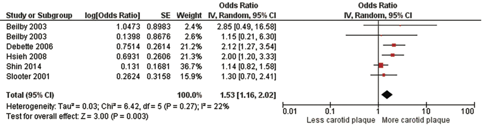 Three meta-analyses were performed. The first meta-analysis examined the association between homozygotes (ε4/ε4) and the presence of carotid plaque (Figure 2, Supplementary Table S4, Supplementary Figure S1). For the meta-analysis evaluating the strength of the association between subjects with ε4 homozygosity and the presence of carotid plaque, 32,046 subjects from five studies (5, 12, 29, 32, 33) were included. There was a significant positive association between the ε4 homozygosity and the presence of carotid plaque with a pooled OR of 1.53 (95% CI: 1.16, 2.02), p = .003. There was no significant heterogeneity, Chi2, 6.42; I2, 22%; (p = .27). After sensitivity analysis with every instance the conclusion did not change the study's original conclusion (p values ranged from <.0001 to.08).