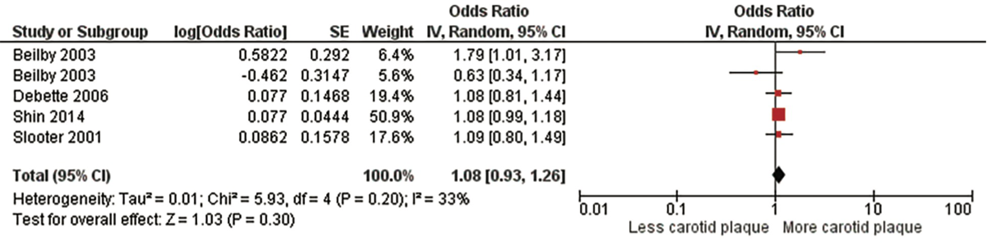 After screening 838 studies, 17 studies were included for systematic review. A meta-analysis of 5 published studies showed a significant association between ε4 homozygosity and carotid plaque [odds ratio (OR), 1.53; 95% CI, 1.16, 2.02; p = .003]. Additionally, there was a significant association between patients possessing at least one ε4 allele, heterozygotes or homozygotes, and carotid plaque (OR, 1.25; 95% CI, 1.03, 1.52; p = .03). Lastly, there was no association between ε4 heterozygosity and carotid plaque (OR, 1.08; 95% CI, 0.93, 1.26; p = .30).