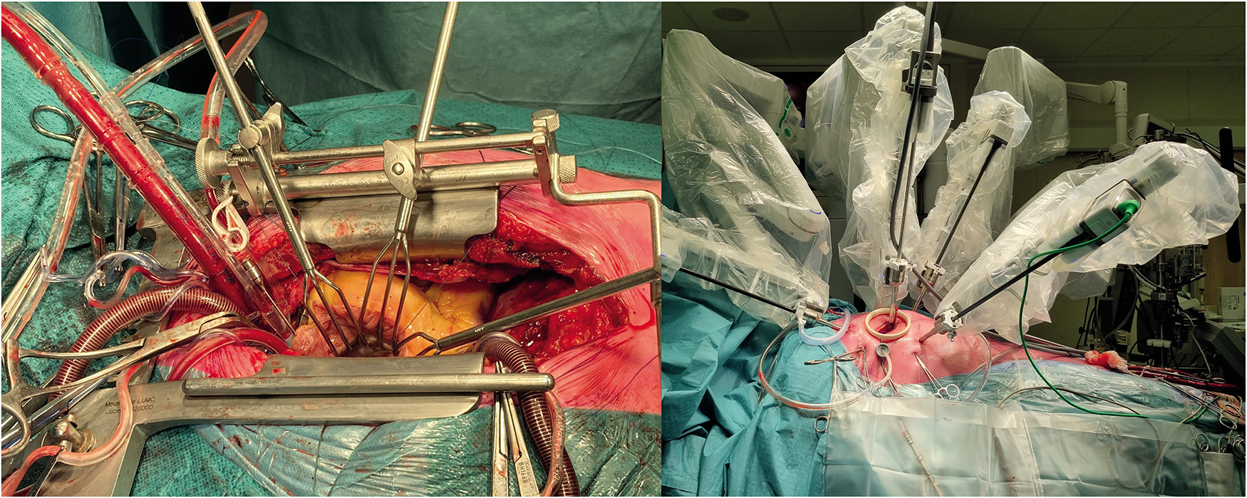 Surgical mitral valve repair through a median sternotomy (left) and robotic lateral mini-thoracotomy approach (right). The lateral mini-thoracotomy approach allows for a less invasive approach without bone fractures.