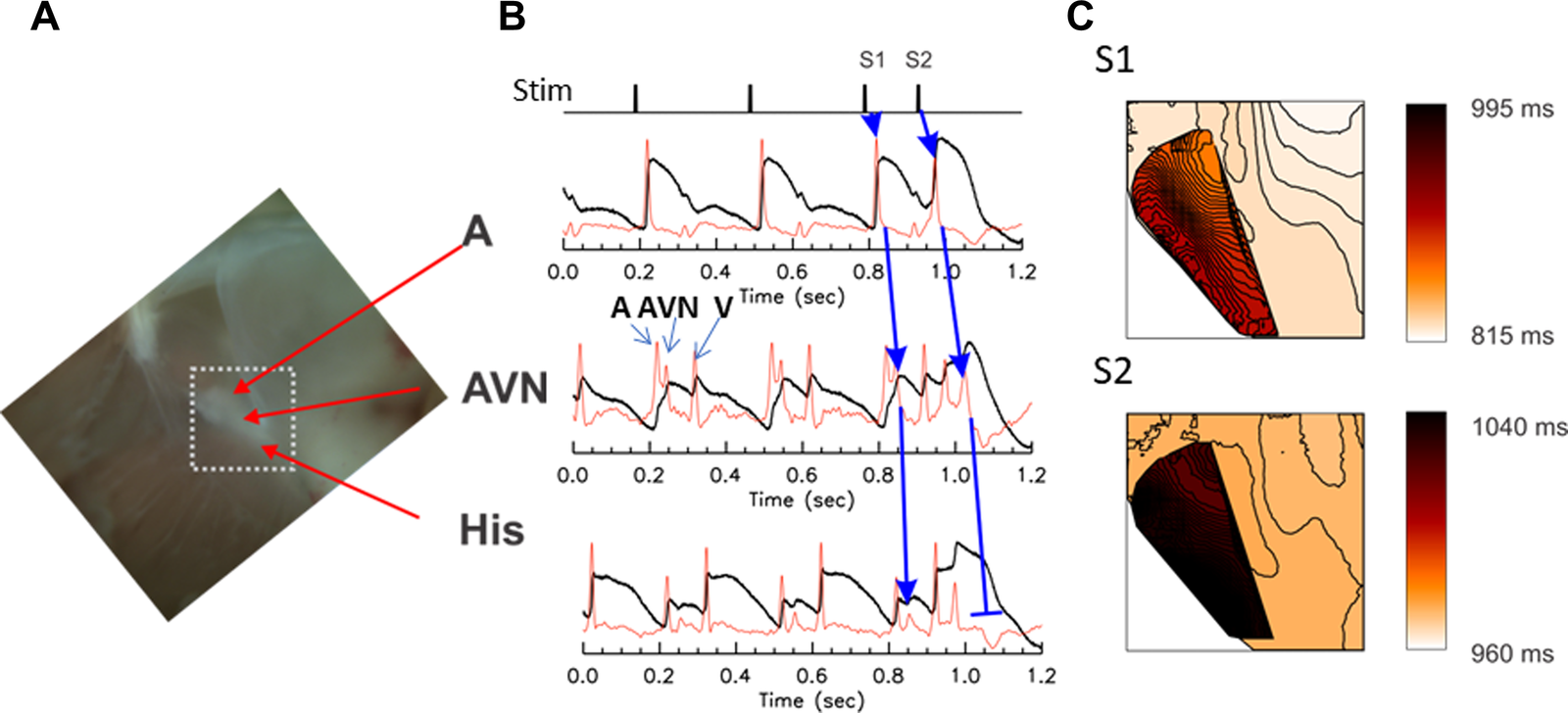 Optical mapping of conduction delay through the AV node. The AV node is a three-dimensional structure consisting of multiple layers of myocytes with different electrical properties and delays in firing; as a result, three distinct upstrokes are detected from each pixel, in the optical voltage-recordings from the AV node region. (A) A photo of the Triangle of Koch. The mapped area is marked with a white dotted box (5 s mm × 5 s mm). (B) Representative optical mapping traces recorded from the AVN region of a rabbit heart under S1–S2 stimulation protocol. The first derivative (red traces) shows three distinct upstrokes associated with atrial (A), nodal/His (AVN, blue arrows), and ventricular (V) AP. The atrial tissue was paced at S1–S2 (basic CL = 300 ms followed by S2 at 140 ms). The upstroke of the AVN AP appeared substantially later in the S2 beat than the S1 beat (see the middle trace) and propagated toward His-bundle with a diminishing magnitude of the AP upstroke compared tothe S1 beat (blue arrows for S2 beat), indicating decremental conduction. (C) Activation maps of atrial and nodal-His upstrokes. The atrial and nodal upstrokes were mapped separately, then are superimposed to visualize the overlap of the atrial and nodal tissues. Isochronal lines are drawn every 1 ms interval. The conduction velocity of AVN propagation of control beat was 0.101 mm/ms while the conduction of premature S2 beat in the AV node was slightly slower (0.08 mm/ms) and died out in the His bundle, in this example. A movie of AV nodal conduction of sinus beat, and S1 and S2 beats are provided as the Supplementary Material respectively as Supplementary Movies S1, S2.