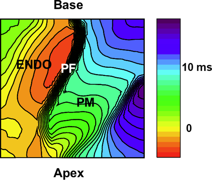 Activation patterns from purkinje-papillary-myocardium. Image of the papillary muscles from the RV septum from a 5 mm × 5 mm region. Activation map of the papillary muscle (PM) under sinus rhythm. An example of activation isochrones (1 msec apart) is shown for a right ventricular papillary muscle in a perfused rabbit heart. A fast wave of depolarization appears first along the PFs lying along the papillary (base to apex), followed by the firing of papillary APs before the spread of electrical activity along the endocardium (ENDO). The Supplementary Movie S7 depicts the sequence of activation demonstrating a wave of PF depolarization followed by the PM depolarization preceding the activation of the endocardium (ENDO) by 2–5 msec.