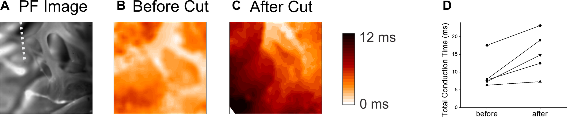 PF network is composed of multiple branches and hubs to provide resilience through redundancy. We further investigated how local branches influence the activation pattern of endocardium by cutting off free-running PF in the field of view. Figure 6 shows an example of PF branches from RV apex region (panel A) and corresponding activation pattern (panel B, Supplementary Movie S8), which shows synchronous activation). After cutting off a PF branch marked with a white dotted line in Panel A, the activation pattern was changed to show a propagating wave from the top to the bottom (panel C, Supplementary Movie S9). Cutting a PF branch increased the total activation time by 5.9 ± 3.6 ms (n = 5, panel D).