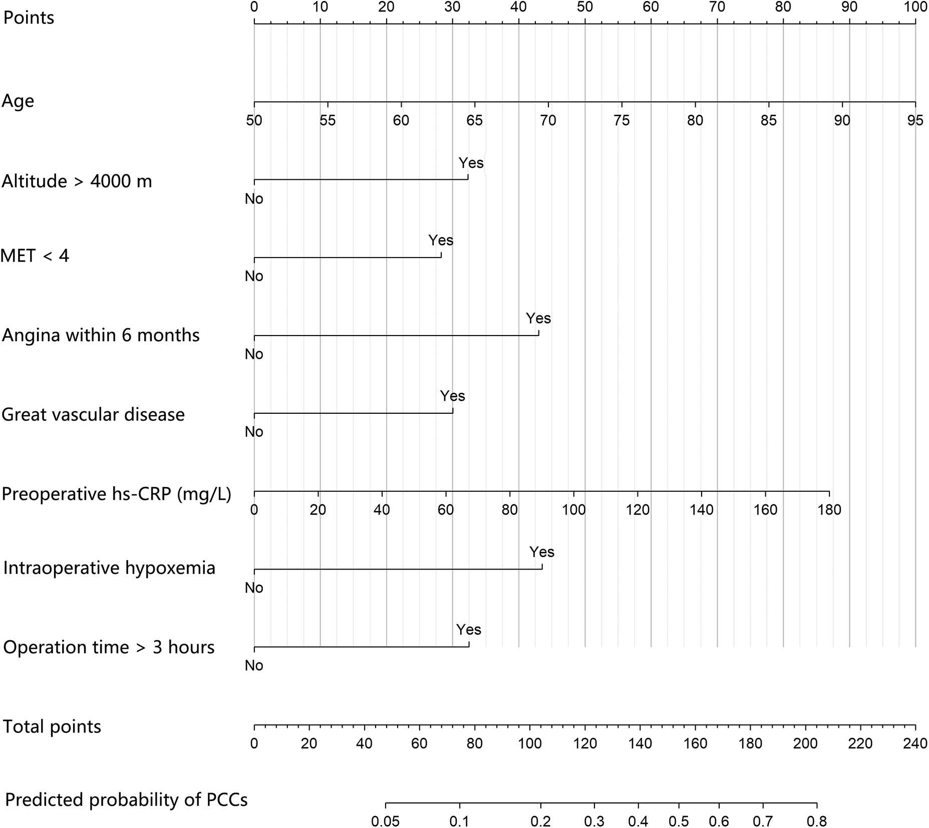 The incidence of PCCs in resident patients living in high-altitude areas who underwent noncardiac surgery was high, and the risk factors included older age, high altitude above 4,000 m, preoperative MET < 4, history of angina within 6 months, history of great vascular disease, increased preoperative hs-CRP, intraoperative hypoxemia, and operation time >3 h. The prognostic nomogram of this study could help to assess the PCCs for patients in high-attitude areas undergoing noncardiac surgery.