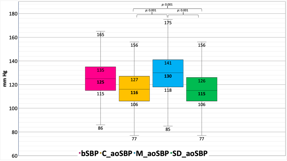 Differences obtained between different approaches and calibration methods for non-invasive measurement of aortic systolic blood pressure (aoSBP) in 1,654 subjects from a population-based study. bSBP: brachial systolic blood pressure. C_aoSBP: aortic systolic blood pressure determined by calibration to brachial diastolic, and mean blood pressure (bDBP, bMBP) calculated (CM) from bSBP and bDBP. M_aoSBP: aortic systolic blood pressure determined by calibration to bDBP, and (bMBP) measured by oscillometry (OscM). SD_aoSBP: aortic systolic blood pressure determined by calibration to bSBP and bDBP (termed systolic-diastolic or “SD”).