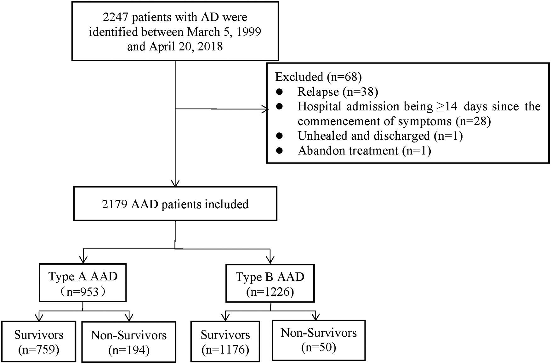 A total of 2,179 AAD patients were enrolled between March 5, 1999 and April 20, 2018 in Wuhan Union Hospital of China. The patients were diagnosed by symptoms, physical examination, transthoracic echocardiography, and magnetic resonance angiography (MRA) or computed tomography angiography (CTA). Before 2001, MRA was used to determine the radiographic evidence whilst CTA was applied to clinic after 2001. Based on the Diagnosis and Treatment of Aortic Dissection published by European Society of Cardiology (ESC) and the Stanford criterion, we diagnosed and categorized AAD patients as type A or B. The exclusion criteria of the study included: (1) relapse; (2) hospital admission being ≥14 days since the commencement of symptoms; (3) unhealed and discharged; (4) abandon treatment (Figure 1).