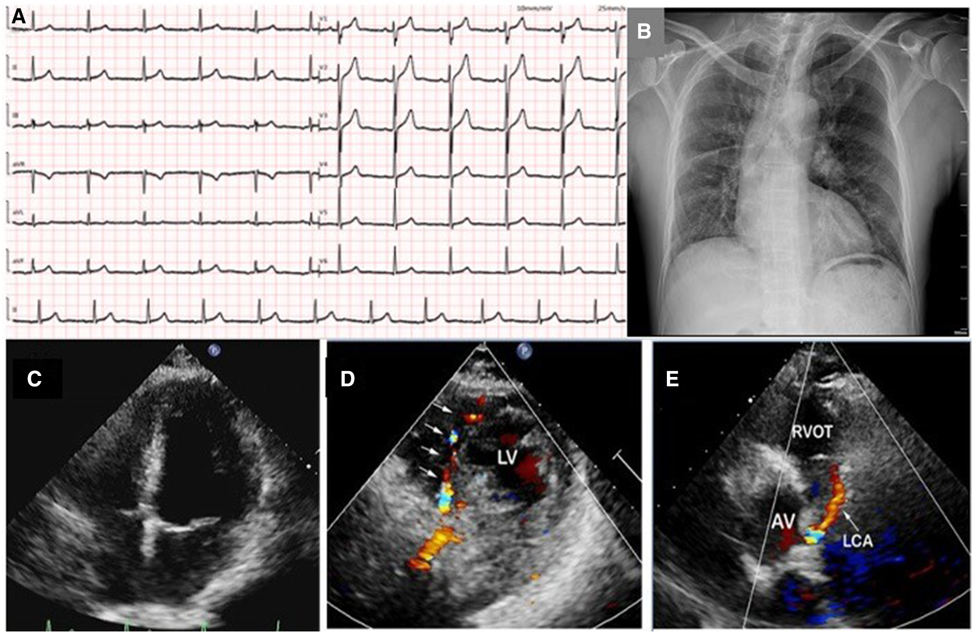 A 12-lead ECG illustrated normal sinus rhythm without ST-segment and T-wave changes (A); chest x-ray showed scoliosis, cardiac enlargement and briefly normal vascular markings on both sides, along with rightward mediastinal shift (B); transthoracic echocardiography revealed normal size of four chambers, left ventricular, and valvular function (C); color Doppler in parasternal short-axis view showed abundant collateral blood signals within the ventricular septum (D); an abnormal continuous blood flow directed into the pulmonary artery was also observed (E). LV, left ventrium; RVOT, right ventricular outflow tract; AV, aortic valve; LCA, left coronary artery.