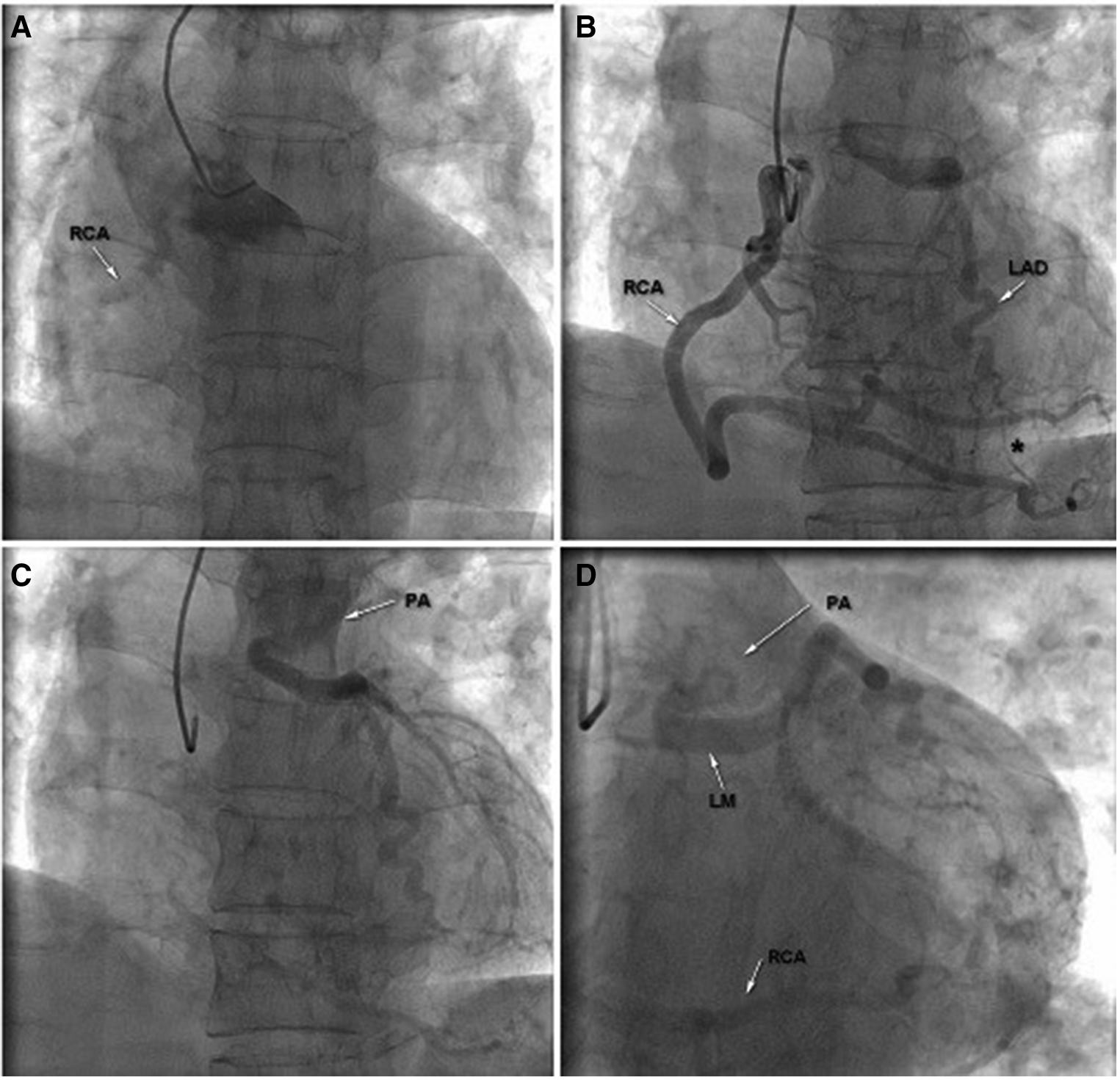 Transradial coronary angiography was performed; however, multiple attempts failed to engage the left main coronary artery (LM) (A); right coronary angiography revealed an extremely large and tortuous RCA arising from the RCC with significant collateral flow from RCA to LCA (B). The blood flow terminated in the pulmonary artery through the LCA and delayed enhanced-imaging demonstrated the LCA filling via extensive intercoronary collateral circulation, which supported the diagnosis of ALCAPA (C,D). LA, left main coronary artery; LAD, left anterior descending; PA, pulmonary artery; RCA, right coronary artery.