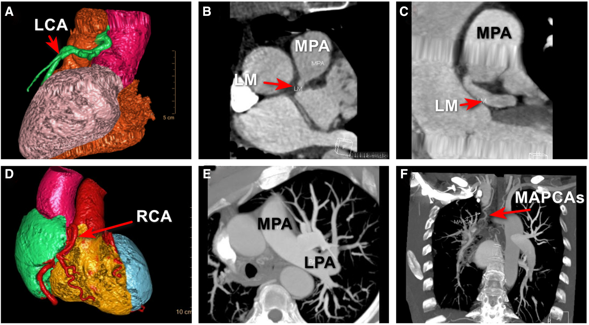 MDCTA revealed that the LCA originated from the right side of main pulmonary trunk and then bifurcated into the left anterior descending artery and the left circumflex artery (A–C); MDCTA showed the compensatory dilated and tortuous RCA (D); an UAPA was incidentally revealed by MDCTA (E); and major aortopulmonary collateral artery was shown (F), which was missed with TTE and CAG. ALCAPA, anomalous origin of the left coronary artery from the pulmonary artery; LCA, left coronary artery; LM, left main coronary artery; LPA, left pulmonary artery; MAPCAs, major aortopulmonary collateral arteries; MPA, main pulmonary artery; UAPA, unilateral absence of pulmonary artery.