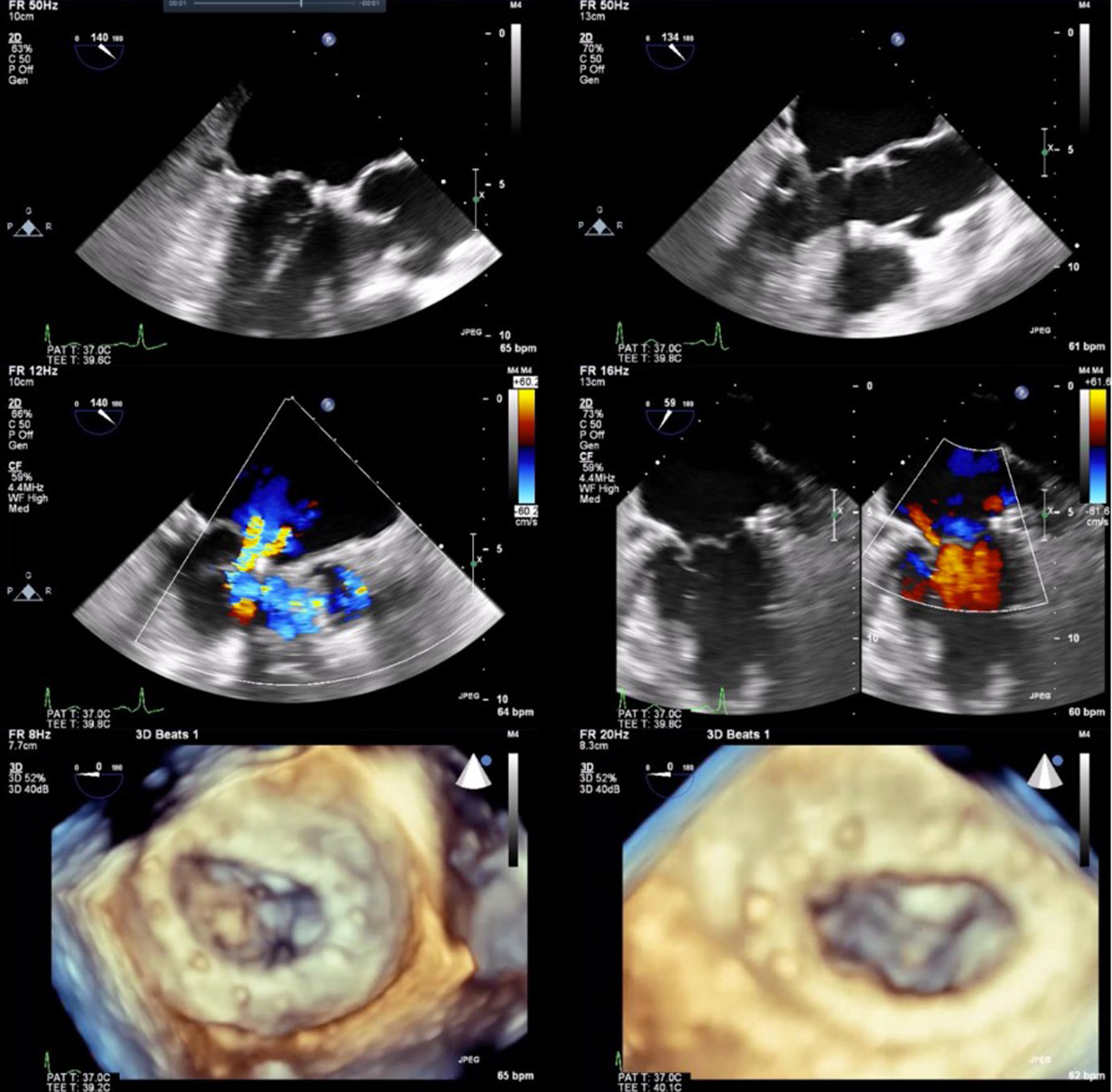 Figure 1. Two and 3-dimensional view of preoperative images (left column) with P2 prolapse and severe MR. Post intraoperative delivery of NeoChord system and NeoChord tightening with mild residual MR (right column).