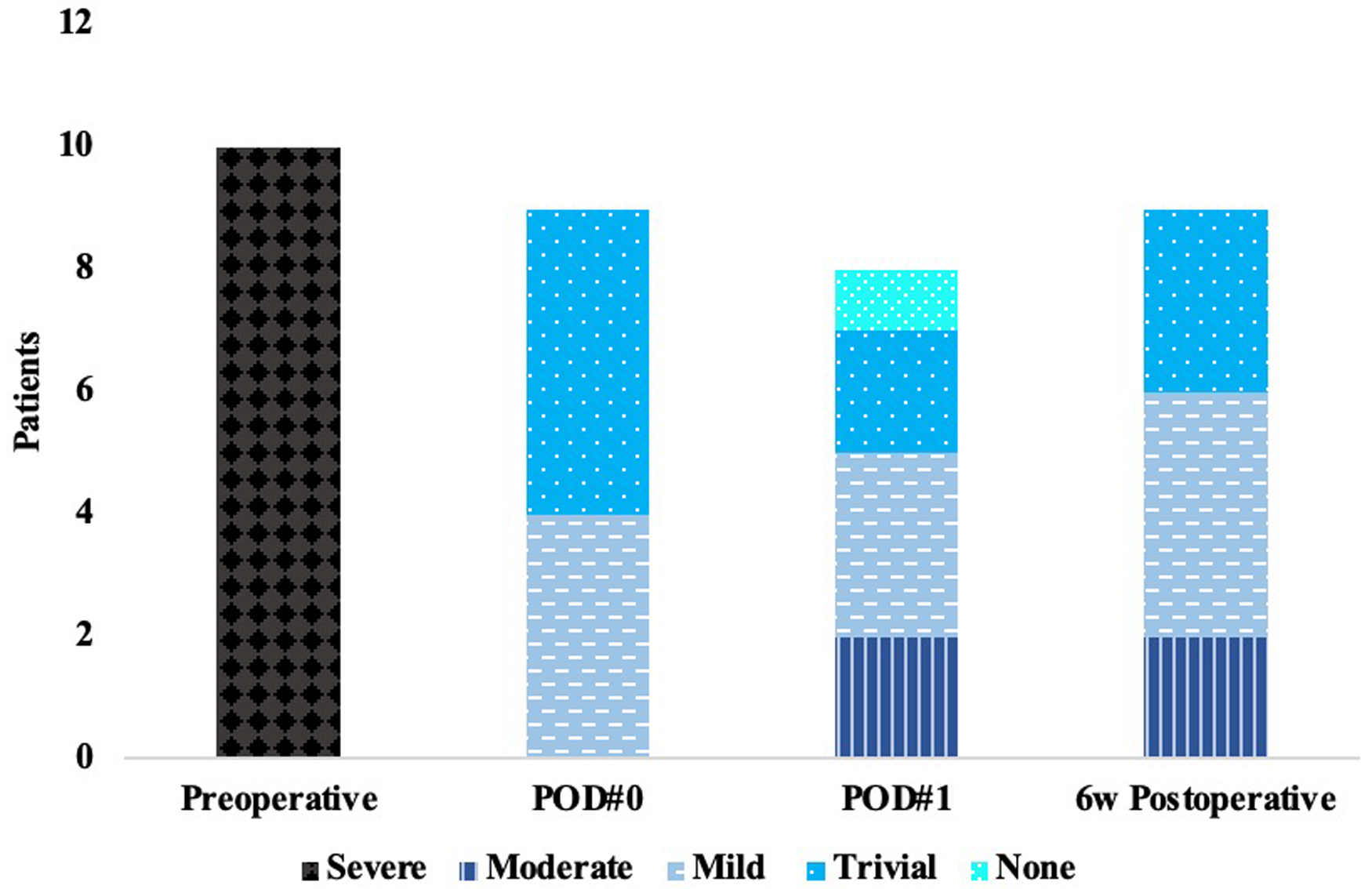 Qualitative intraoperative post repair TEE found trivial MR in 5 patients and mild MR in 4 patients. Average length of coaptation was 0.86 ± 0.20 cm and average depth of coaptation was 0.72 ± 0.15 cm. On POD#1, there was no MR in 1 patient, trivial in 2 patients, mild in 3 patients, and moderate in 2 patients (Figure 2). One patient did not have a transthoracic (TTE) on POD#1. At 6-week TTE follow-up, the degree of MR ranged from trivial in 3 patients, mild in 4 patients, and moderate in 2 patients. Left ventricular inner diameter in diastole (LVEDD) decreased from an average of 5.4 ± 0.4 cm preoperatively to 4.6 ± 0.3 cm, measured 6 weeks postoperatively, a 15% decrease. Mean left ventricular ejection fraction (LVEF) preoperatively was 61%, 54% on POD#1, and was 52% at 6 weeks postoperatively.