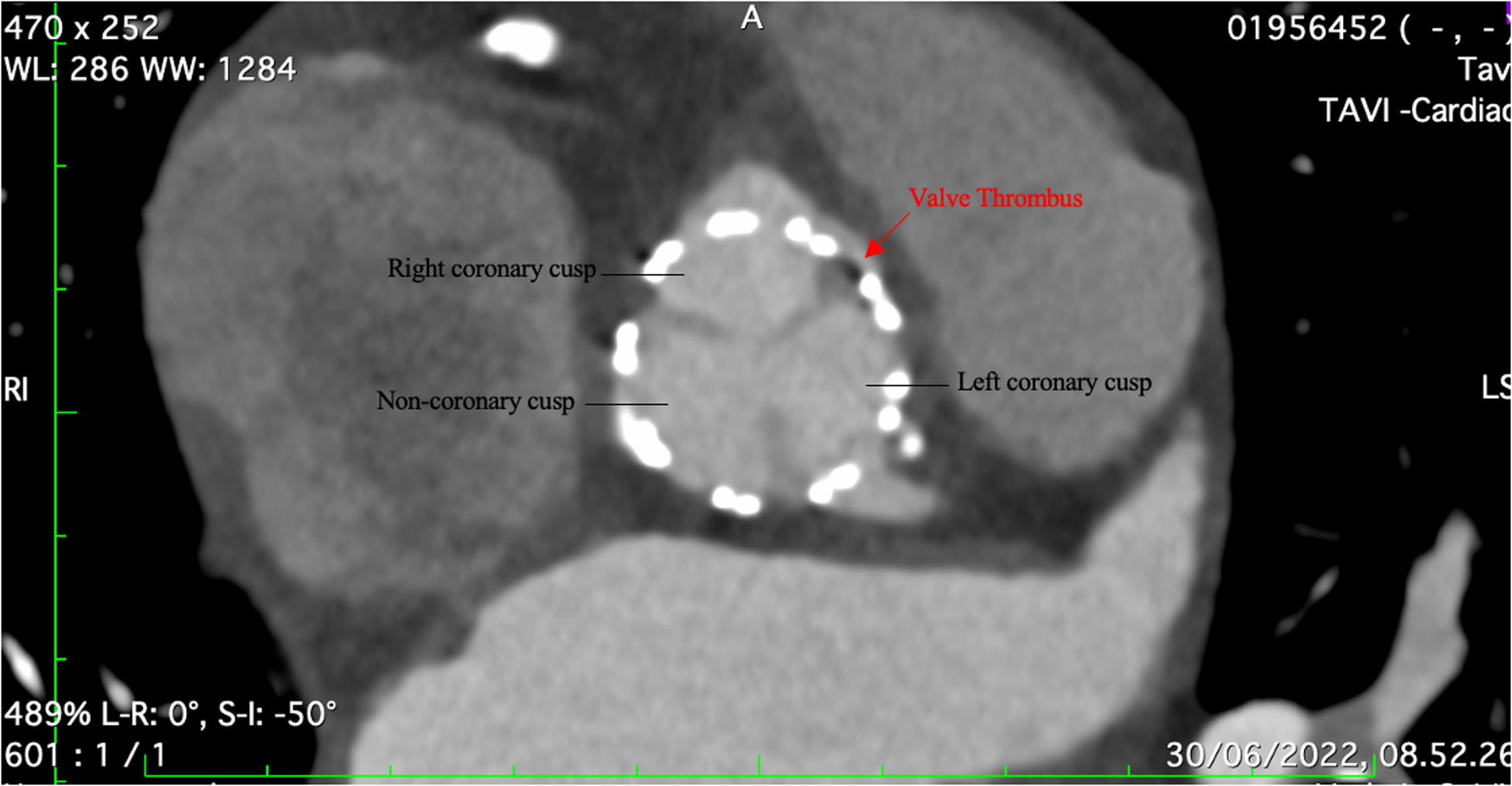 CT angiography showing a small thrombus between the right coronary and left coronary cusp.