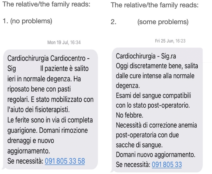The study was designed as a single-centre, prospective, randomised study (two arms, A and B). Physicians, nurses, and physiotherapists were involved in the project; the design of the study protocol was performed by the division of cardiac surgery of Cardiocentro Ticino Institute, along with the faculty of biomedical sciences, the faculty of communication of the University of Svizzera Italiana (USI), and the University of Applied Sciences and Arts of Southern Switzerland (SUPSI). Briefly, a traditional postoperative communication was carried out in a standard fashion for group A (16 patients), performed with telephone communications, mainly at the initiative of relatives or, in the case of significant events, at the initiative of the care team. A second study group (group B, 32 patients) received a postoperative digital communication by text messages (SMS) sent electronically from patients’ clinical record (Figure 1). Specifically, the introduction of a digital communication module attached to the electronic patient record allows relatives to be informed on a daily basis (Figure 2). It is an additional code programmed and included into our institutional Enterprise Resource Planning (ERP) licensed software (“Whale”).