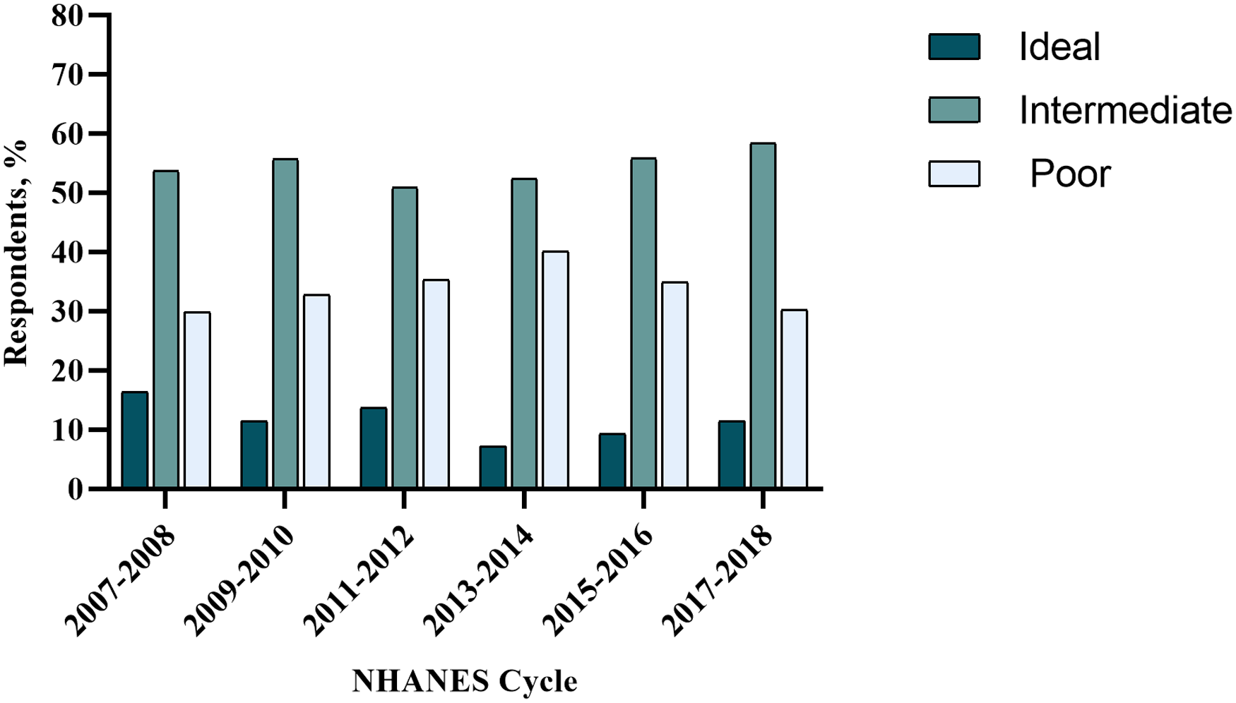 Because data were not available for all factors between 1999 and 2006, we assessed the number of unhealthy lifestyle factors in each respondent from 2007–2008 to 2017–2018. A respondent was given 1 point for unhealthy lifestyle factors, up to a maximum of 6 points. The unhealthy lifestyles score was classified into three levels: ideal (0 points), intermediate (1–2 points), or poor (3–6 points).