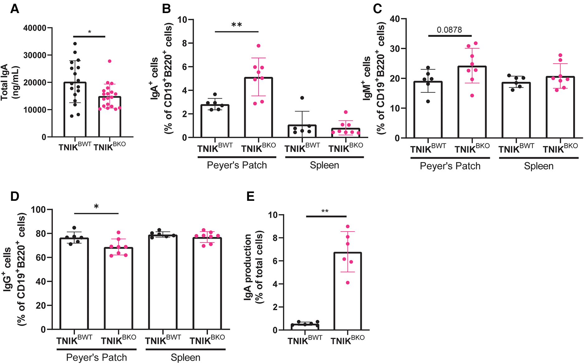 TNIK B cell deficiency increases IgA production. (A) Blood plasma was isolated and analyzed for IgA levels, which were decreased in TNIKBKO compared to TNIKBWT mice (n = 17/19). (B–D) Cells from intestinal Peyer's Patches and spleen were analyzed via flow cytometry for IgA+, IgM+ and IgG+ expressing cells (CD45+) (n = 6/8). (E) Splenic resting B cells (CD43−) were isolated and stimulated with αCD40, IL-4, IL-5, TGF-β and αIgD to differentiate into plasma cells, which were analyzed via flow cytometry for IgA expression (n = 6 per genotype).