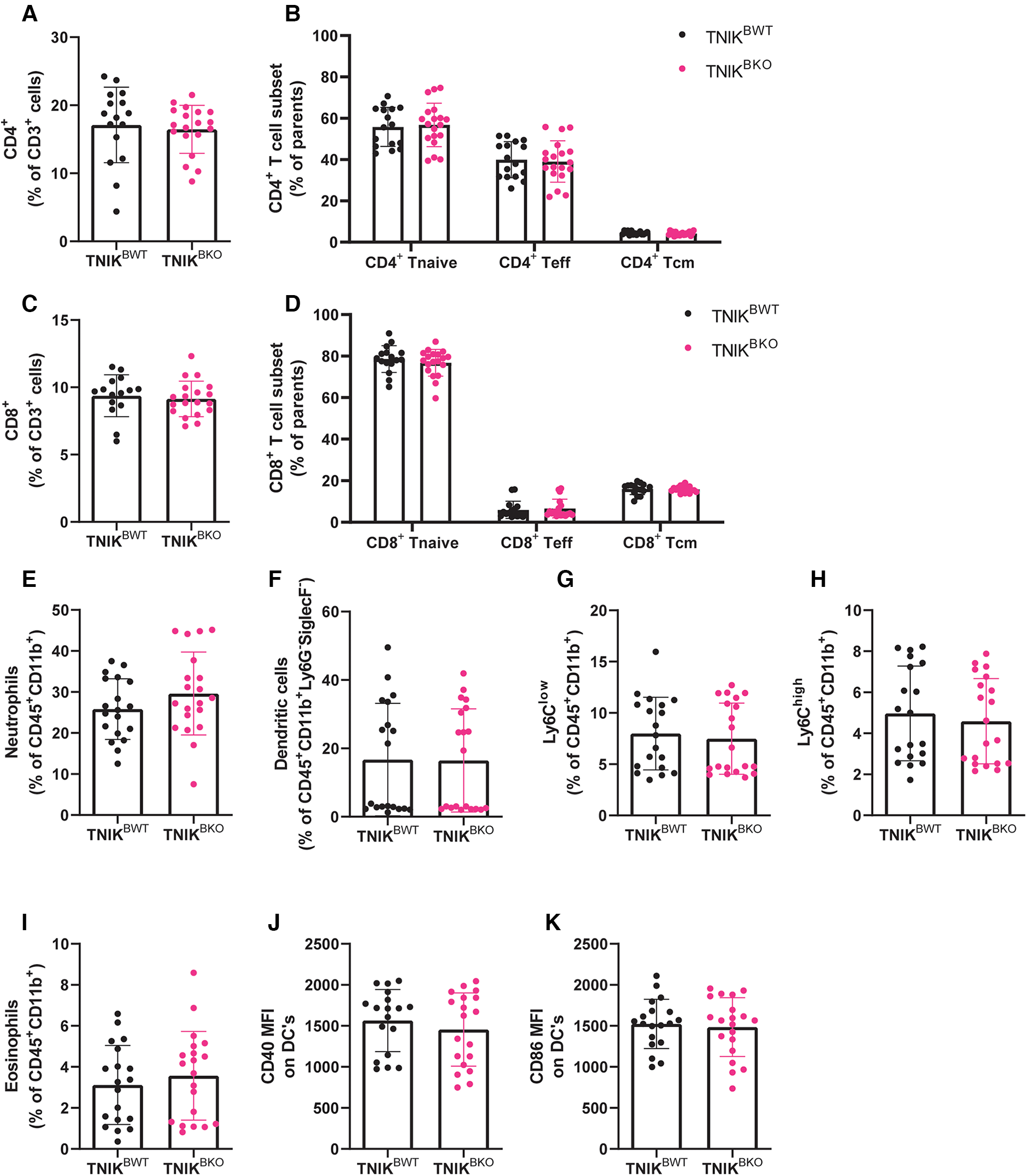 B cell TNIK deficiency does not affect T cell ratios or myeloid populations in the spleen. The CD4+ and CD8+ T cells from the spleens of TNIKBWT and TNIKBKO mice were analyzed via flow cytometry. (A) Total CD4+ T cells, alongside (B) their subsets, naive (CD44−CD62L+), effector (CD44+/−CD62L−) and central memory T cells (CD44+ CD62L+), are unaffected by B cell TNIK deficiency (n = 16/20). (C) Total CD8+ T cells and (D) its subsets, naive (CD44−CD62L+), effector (CD44+/−CD62L−) and central memory (CD44+ CD62L+), are unaltered in the TNIKBKO compared to TNIKBWT mice (n = 15/19). Splenic myeloid cells (CD45+ CD11b+) were also analyzed by flow cytometry. (E) Neutrophils (ly6G+SiglecF−), (F) dendritic cells (MHCII+CD11c+), (G) non-classical Ly6Clow monocytes, (H) classical Ly6Chigh monocytes and (I) eosinophils (Ly6GlowSiglecF+) were unaffected by genotype. Further activation status of dendritic cells by measuring (J) CD40 and (K) CD86 expression revealed no differences between TNIKBWT and TNIKBKO mice [(E,G–K) n = 19/20, and (F) n = 10/10].
