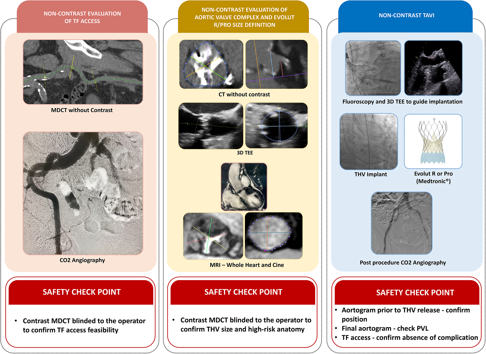 Central illustration. TAVI with zero-contrast strategy using the self-expandable Evolut R/Pro THV in patients with chronic kidney disease. The non-contrast approach included three major steps. (1) Feasibility of the transfemoral approach and the entry site determined by non-contrast multidetector computed tomography (MDCT) and an aortoiliac CO2 angiography in the pre-procedural work-up. (2) Detection of high-risk anatomy for annulus rupture, severe paravalvular leak (PVL), or coronary occlusion based on non-contrast MDCT. Patients with high-risk anatomy were excluded. THV sizing was based on (i) sinus of Valsalva (SOV) mean diameter assessed by non-contrast MDCT and (ii) annulus perimeter (AP) assessed by 3D-TEE and non-contrast magnetic resonance imaging (MRI) by two methods, 3D whole-heart and cine SSFP. (3) TAVI procedures were performed under general anesthesia and guided by TEE and fluoroscopy, using the optimal projection defined by the non-contrast MDCT.