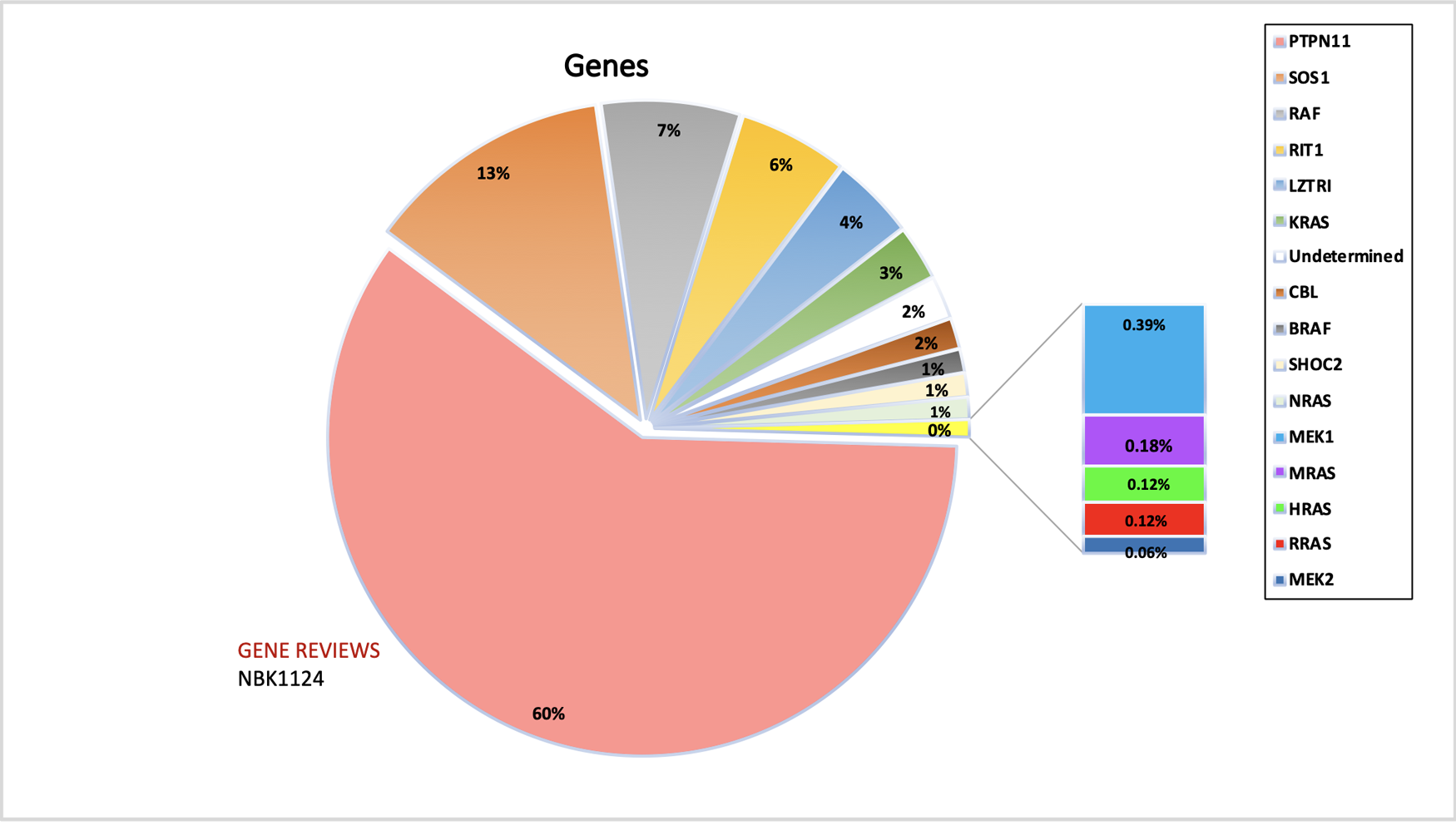 The figure represents the information of the genes implicated in NS and associated RASopathies. PTPN11, SOS1 and RAF alone makes up for more than 90% of the total pathogenic mutations. The data is obtained from the NSEuroNet database.