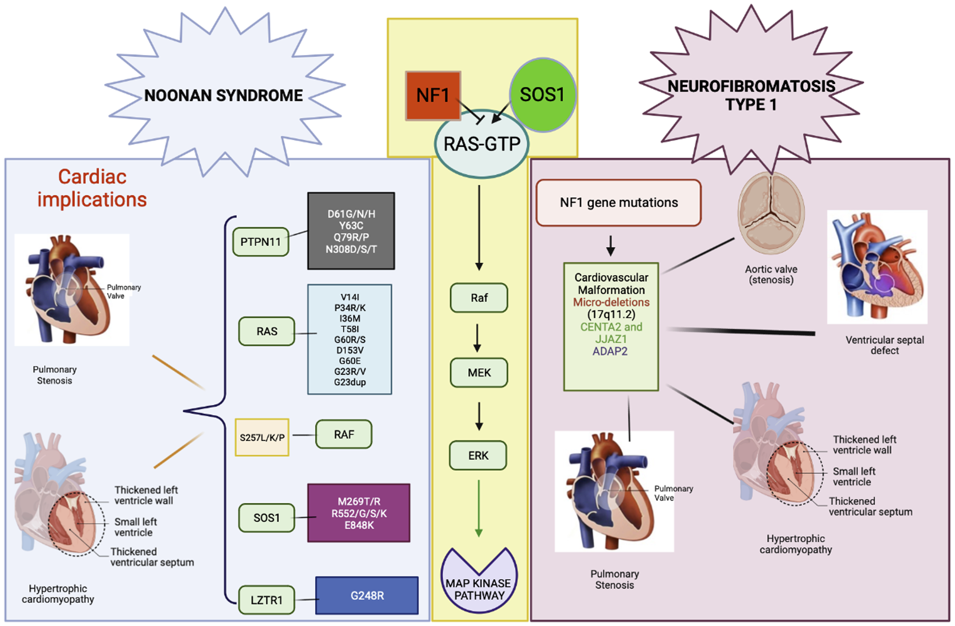 Rat Sarcoma Virus, a highly conserved protein, belongs to a class of proteins called small GTPase. The three most widely studied RAS genes in humans are HRAS, KRAS, and NRAS, named after the Harvey Rat sarcoma virus, Kirsten Rat sarcoma virus, and NRAS, for its initial identification in neuroblastoma cells. Since the identification of the RAS protein in 1982, extensive studies have been conducted to identify the RAS-associated pathway and its involvement in human disease. RASopathies refer to multisystem disorders caused by gene mutations that belong to the RAS/MAPK (Mitogen-activated protein kinase) signaling pathway. RAS can be either “switched on” or activated by incoming signals through growth factors binding to receptor tyrosine kinases (RTKs), G-protein-coupled receptors, cytokine receptors, and extracellular matrix receptors, or activated by mutations in RAS genes, which can lead to the production of permanently activated RAS proteins and can cause unintended and overactive signaling inside the cell, even in the absence of incoming signals. The mitogen-activated protein kinase (MAPK) pathway is one of RAS's critical downstream signaling cascades. Activated RAS leads to the phosphorylation of Raf, leading to the activation of the MAPK kinases MEK1 and/or MEK2; these, in turn, phosphorylate and activate ERK1 and/or ERK2. ERK1 and ERK2 are the ultimate effectors which exert their function on many downstream molecules in the cytoplasm and nucleus (Figure 1). RASopathy disorders include wide range of disorders such as neurofibromatosis type 1, Noonan syndrome, Noonan syndrome with multiple lentigines, Costello syndrome, cardio-facio-cutaneous syndrome, and Legius syndrome (1, 2), exhibiting multi-organ dysfunction, including craniofacial dysmorphology, cardiac malformation, cutaneous, musculoskeletal, and ocular abnormalities, neurocognitive impairment, hypotonia and increased cancer risk (1–3). In Table 1, we summarize the critical and cardiac-specific features as well as all other RASopathy-associated malformations. This review will discuss only the cardiac manifestation in RASopathies associated with Noonan syndrome and Neurofibromatosis type 1 (NF1). RASopathy-related heart defects include congenital heart disease (CHD), hypertrophic cardiomyopathy (HCM) as well as dilated cardiomyopathy (DCM).