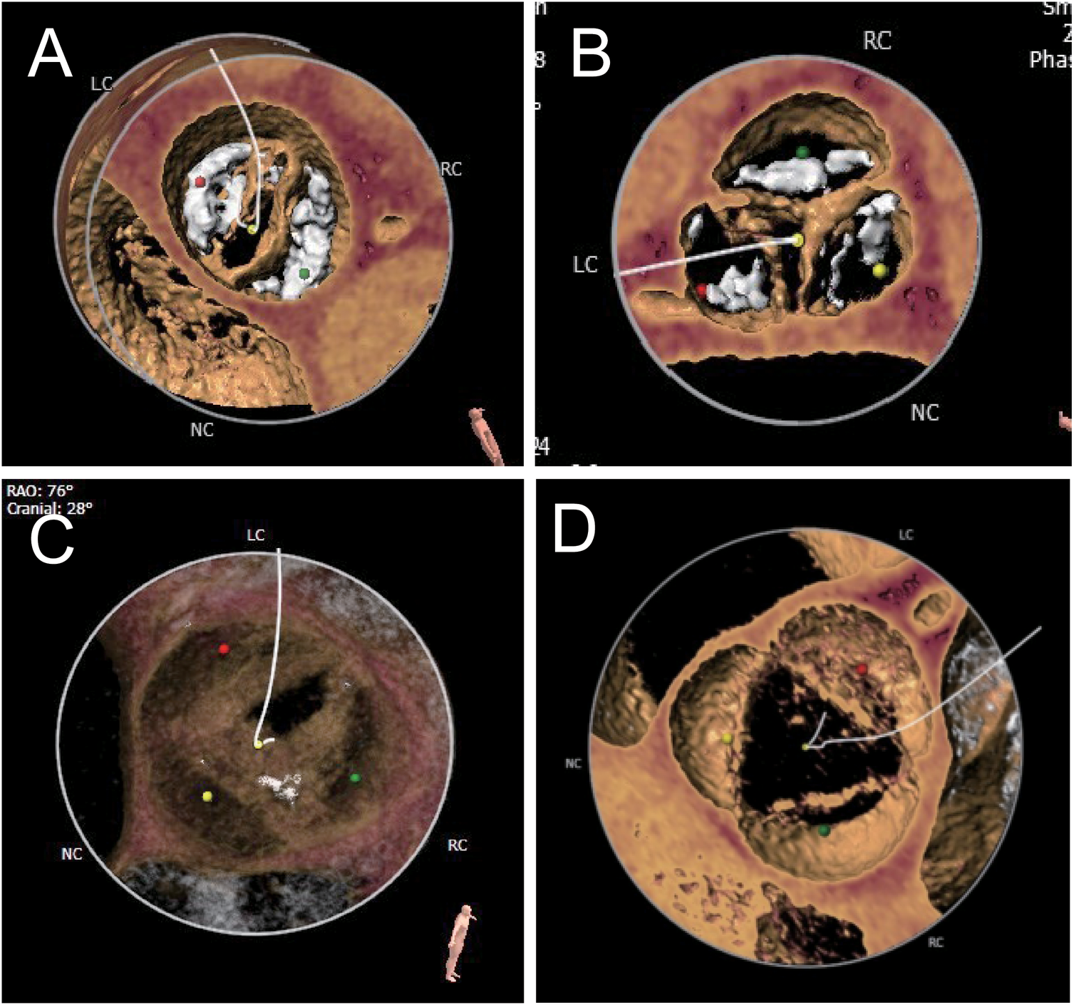 The optimal goal of modest annulus area oversizing is usually 10%–25% for self-expandable THVs (15) and 5%–10% for balloon-expandable valves (16). Our center uses a size-reduction strategy setting the oversizing of the annular area to 5%–10% for self-expandable THVs or 0%–5% for balloon-expandable for most patients with bicuspid aortic stenosis. The bottom of THV is 0–2 mm lower than the annulus plane.