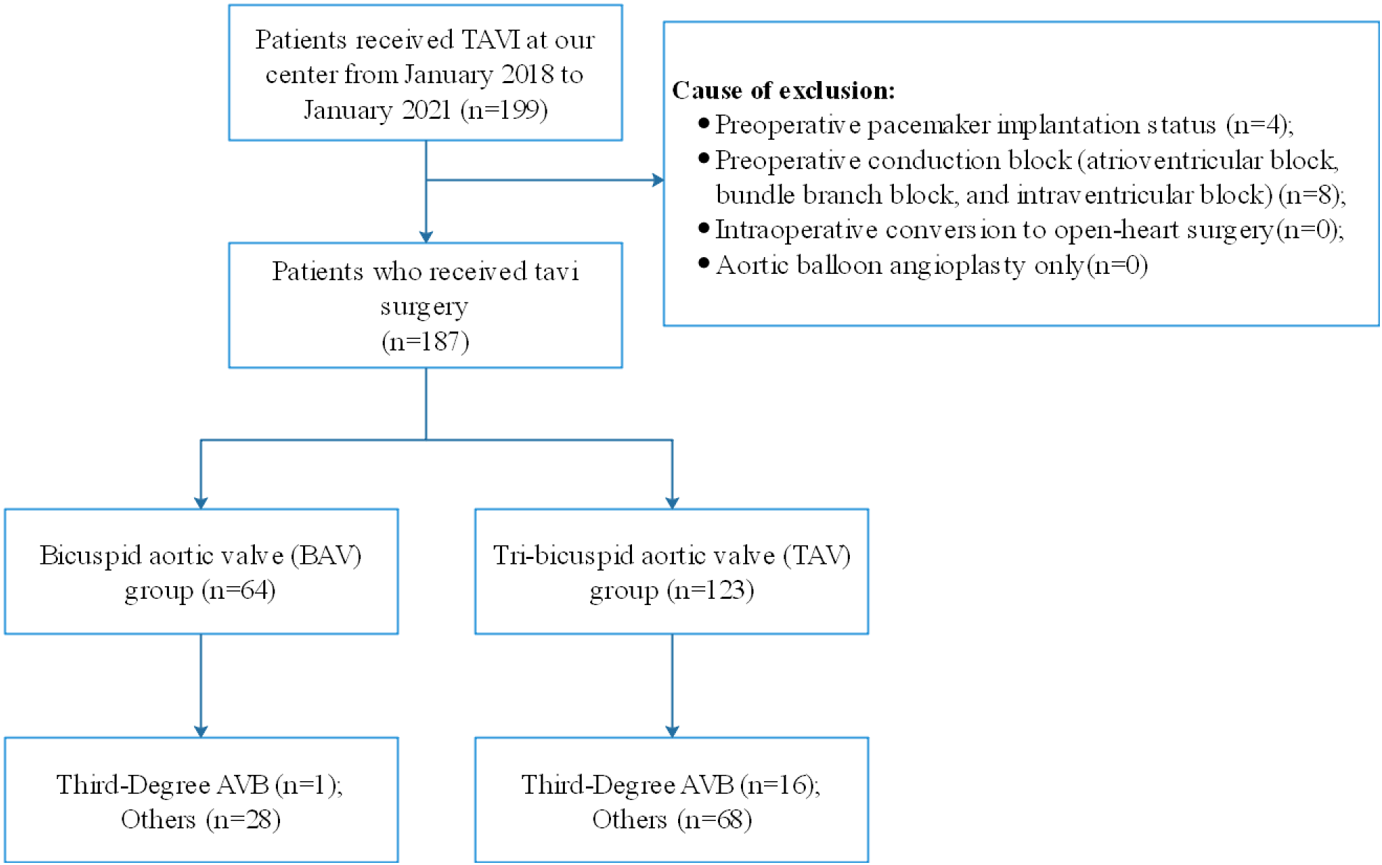 Flow diagram showing the numbers of individuals at each stage of the study. TAV, tricuspid aortic valve; BAV, bicuspid aortic valve; AVB, atrioventricular block; TAVI, transcatheter aortic valve implantation.