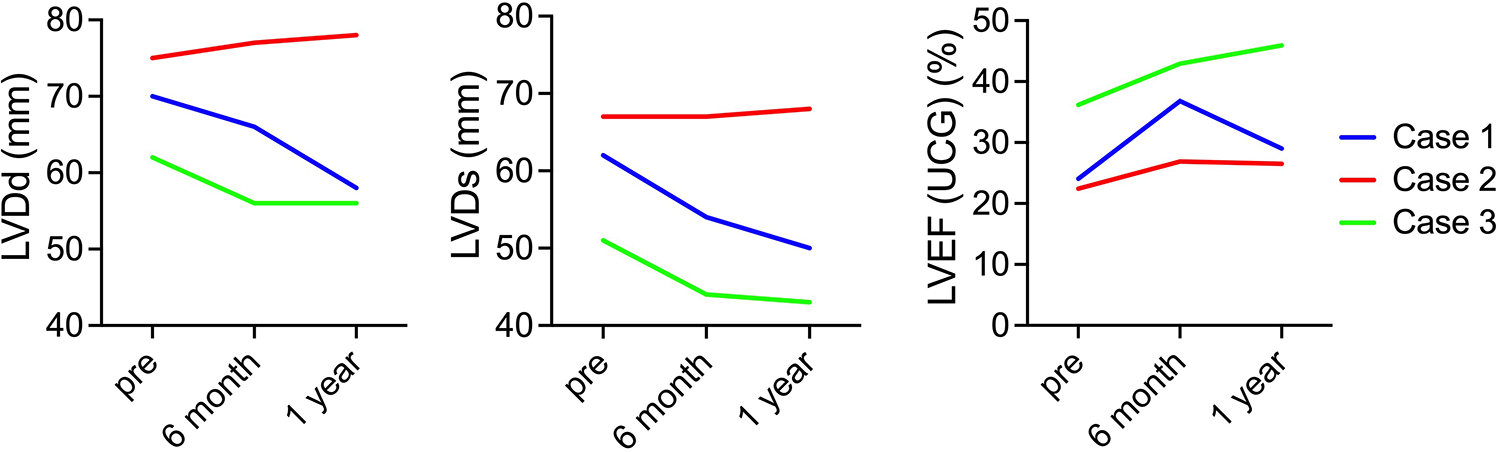 Serial changes in cardiac function. The images show serial changes in LVDd, LVDs, and LVEF on echocardiography. The red, blue, and green charts indicate changes in the first, second, and third cases. LVDd, left ventricular end-diastolic diameter; LVDs, left ventricular end-systolic diameter; LVEF, left ventricular ejection fraction.