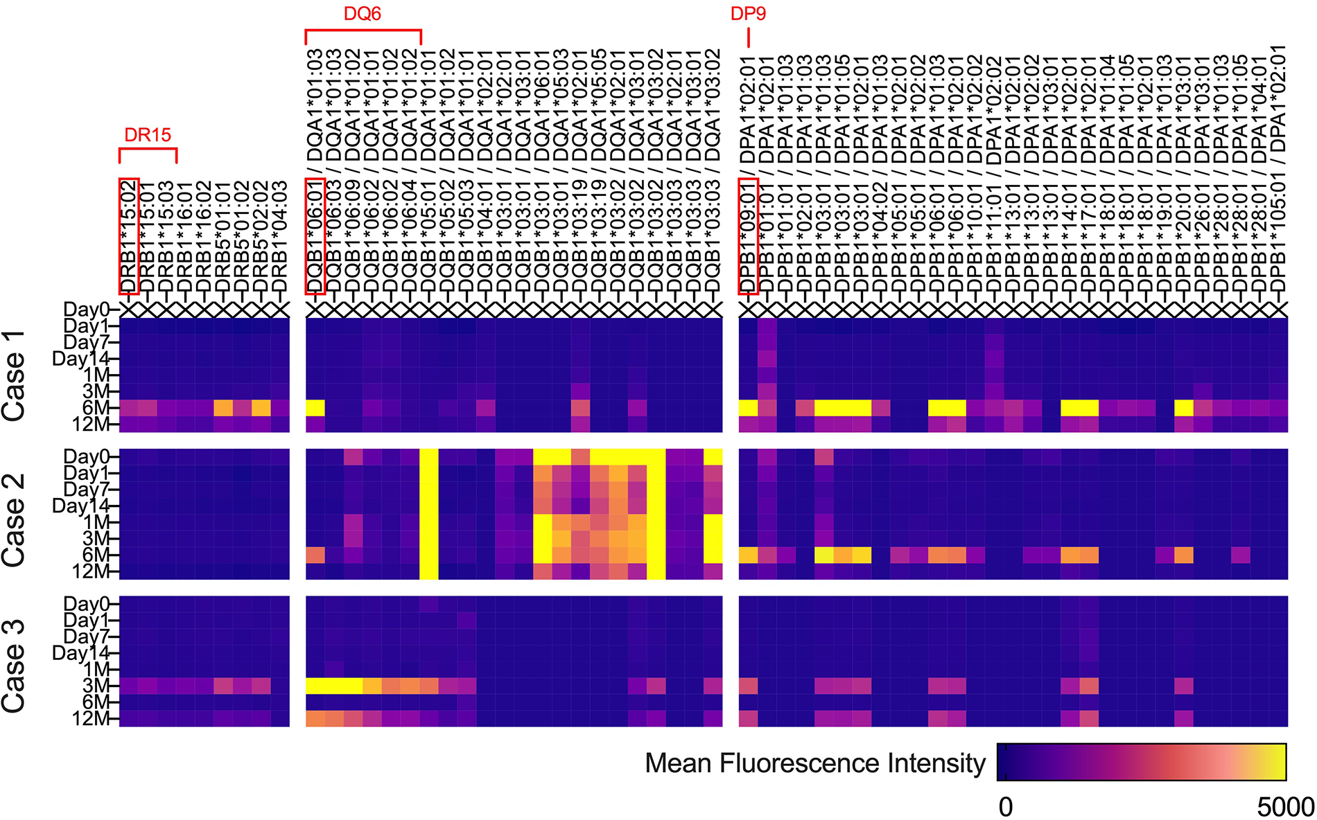 Figure 4 describes the changes in fluorescence intensities for representative HLA class 1 allele (HLA-A, B, and C) that are specific or cross-reactive with the HLA type of transplanted cells. Similarly, Figure 5 shows the changes in fluorescence intensities for all evaluated HLA class 2 alleles (HLA-DRB1, DQB1, and DPB1).