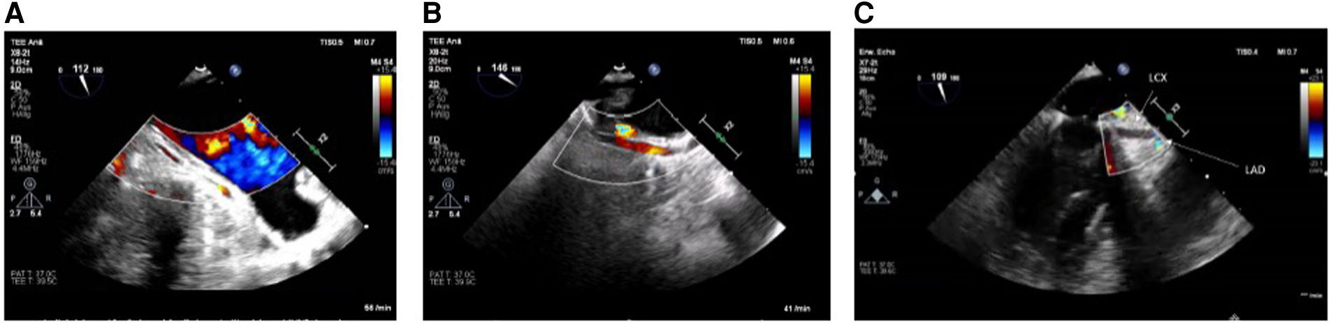 (A) LCX in long axis without flow in the midsegment through suture occlusion (TOE view: modified mid-esophageal aortic valve long axis view according to ender et al. (35) (ME AV LAX) with color flow Doppler, Nyquist limit <30 cm/s). (B) As a contrast: inconspicuous longitudinal view of a prominent LCX (TOE View: modified Mid-esophageal long axis view (mod. ME LAX) with color flow Doppler, Nyquist limit <30 cm/s. (C) Prominent LCX in long axis without flow detection in the proximal third and without the possibility of echocardiography imaging the LCX in the full length due to an estimated occlusion to be expected further peripherally [TOE view: modified mid-esophageal two chamber view (ME 2CH) with color flow Doppler, Nyquist limit <30 cm/s].