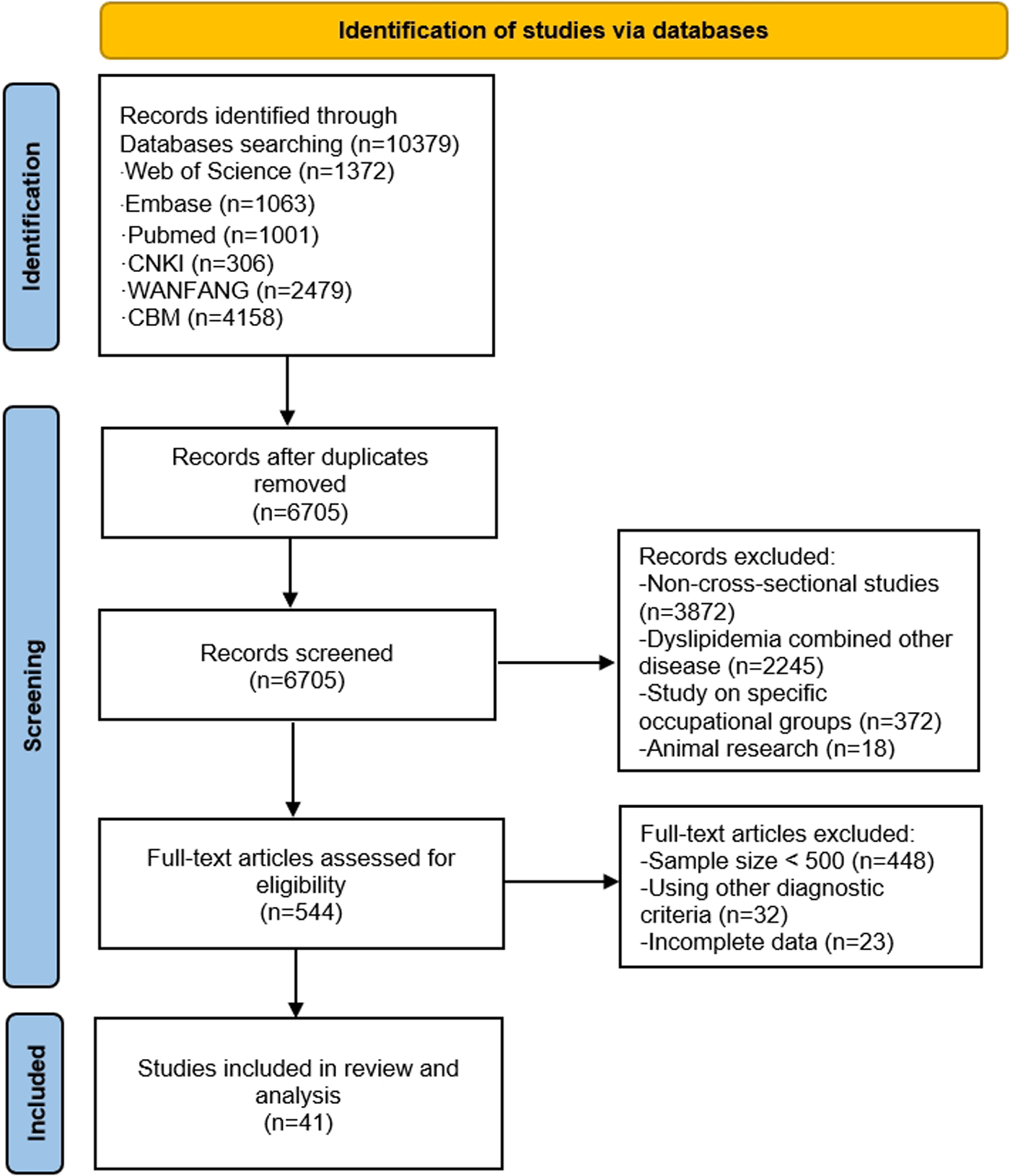 Eligibility criteria were set as followed: (1) research types: original cross-sectional studies; (2) study participants: Chinese adults; (3) the criteria of prevalence, awareness, treatment, and control rates of dyslipidemia were set based on the latest guideline of Prevention and Treatment for Dyslipidemia in Chinese adults (42).