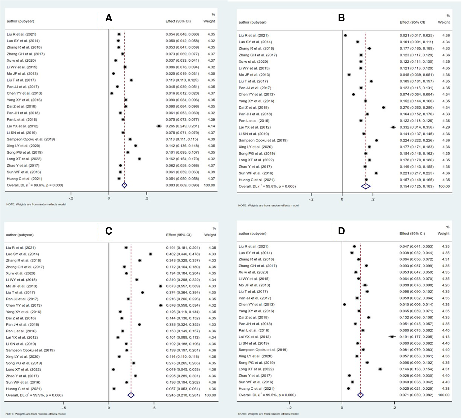 We calculated the pooled rates of prevalence, awareness, treatment, and control and corresponding 95% confidence intervals (95% CI) with a systematic analysis approach. Heterogeneity among studies was examined by Cochran's Q test and I2 statistic. The I2 statistic value at 25%, 50%, and 75% indicated a low, moderate, and high degree of heterogeneity, respectively (44, 45). The random-effect model will be used if the result suggested a high degree of heterogeneity (I2 > 50%). Otherwise, the fixed-effect model will be used (46).