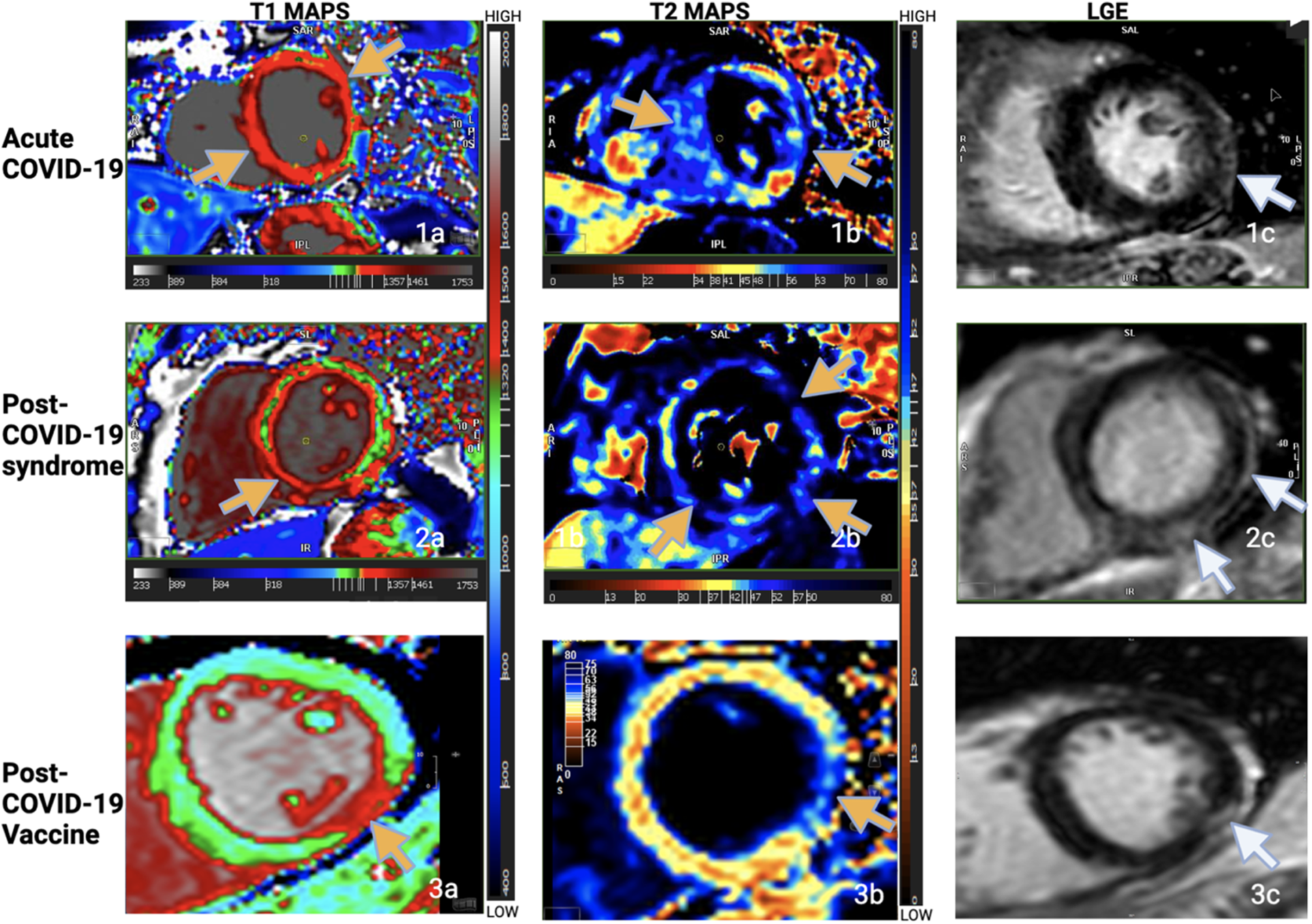 T1 maps, T2 maps, LGE imaging from one patient from each of the groups. Increased T1 and T2 times in the maps as shown by the yellow arrows. Subepicardial lateral or inferolateral scar in the basal or mid slices as shown by the white arrows. Note the pattern and location of myocardial injury in all three groups. (Figure adapted from the abstract poster by Garg et al. “Comparison of CMR Findings in Symptomatic Patients with Different COVID-Related Syndromes”, SCMR 25th annual scientific sessions, 2022. I am an author of this article; the conference grants authors the right to reuse their own figures without permission in future work.).