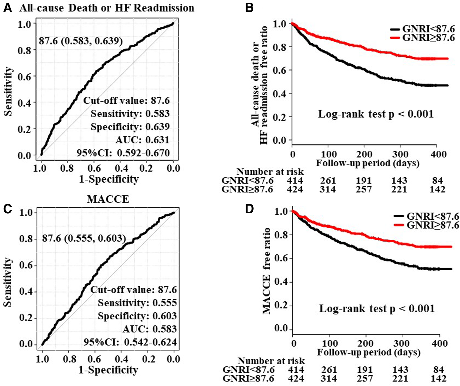 Overall, 1,078 HF patients were admitted to YPGM Center. Of those, 839 (median age 84.0, 52% female) met the study criteria. During the follow-up of 228.0 days, 72 patients reached all-cause death (8%), 215 experienced HF readmission (23%), and 267 reached MACCE (30%: 25 HF death, six cardiac death, and 13 strokes). A multivariate Cox proportional hazard regression analysis revealed that the GNRI predicted the primary outcome (Hazard ratio [HR]: 0.957; 95% confidence interval [CI]: 0.934–0.980; p < 0.001) and the secondary outcome (HR: 0.963; 95%CI: 0.940–0.986; p = 0.002). Furthermore, a multiple logistic regression model using the GNRI most accurately predicted the primary and secondary outcomes compared to those with the SPPB or BI models.