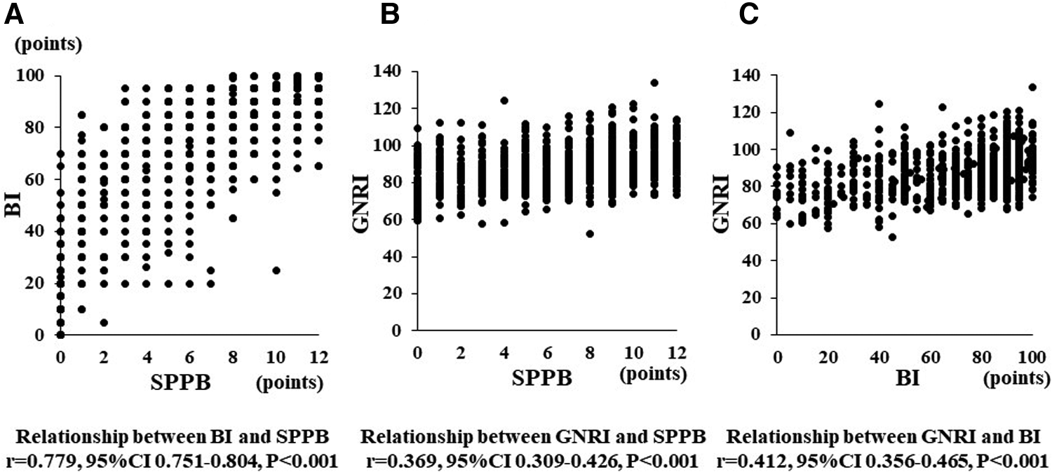 We evaluated the GNRI calculated as (14.89 × albumin) + 41.7 × [body weight(kg)/ideal body weight(kg)] (20) just before discharge. SPPB assessing a lower-limb function consists of gait speed (4-meter walk time), 5-second chair standing time, and balance (closing the legs, semi-tandem, and tandem). Each test scored from 0 to 4, with a total score ranging from 0 to 12 points; a higher score indicates a better lower limb function (22). BI measured the capacity in ADL, the BI is a major index with ten items, and the total BI score ranged between 0 and 100 points, with higher values indicating a higher level of independent physical state (27). The cut-off value of BI was identified that 85 points, 60 points, and 40 points, respectively (28). SPPB and BI were evaluated within five days of discharge, and body weight and serum albumin for calculating GNRI were assessed just before discharge.