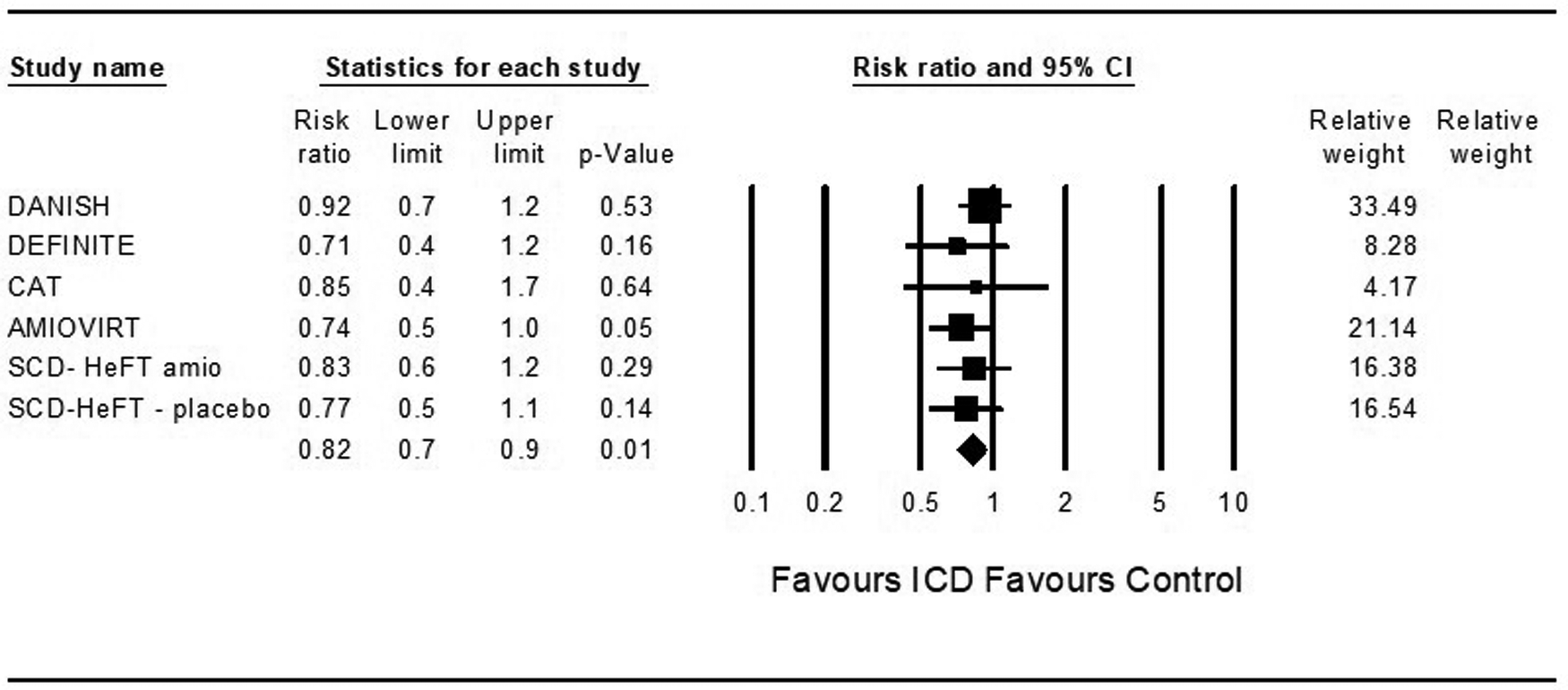| Comparison | ICD vs. OMT | ICD vs. Amiodarone vs. OMT | ICD vs. OMT | ICD vs. Amiodarone vs. OMT | ICD vs. OMT |