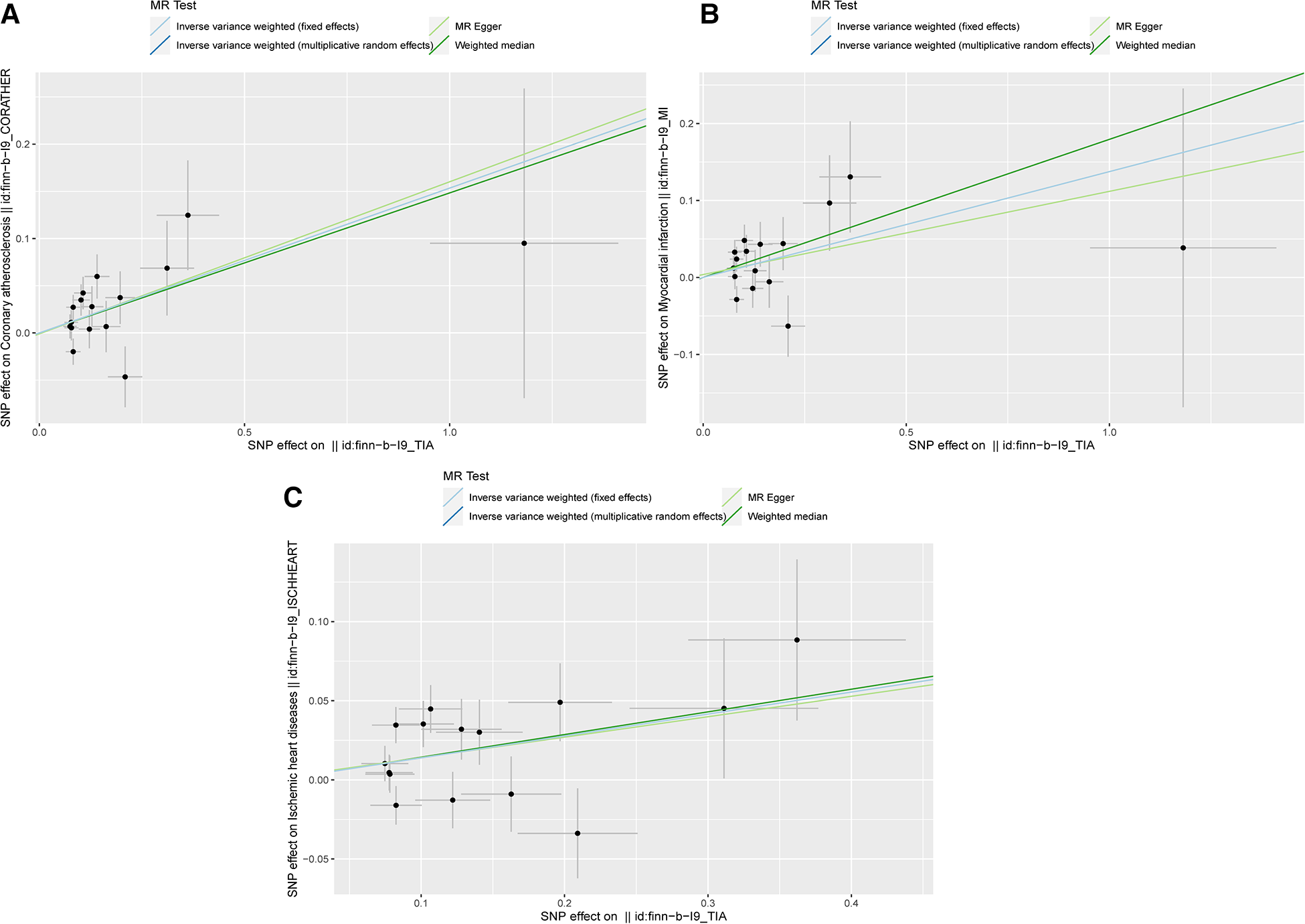 The scatter plots of MR analysis. (A) The scatter plot of the causality between TIA and CAA; (B) The scatter plot of the causality between TIA and MI; (C) The scatter plot of the causality between TIA and IHD.