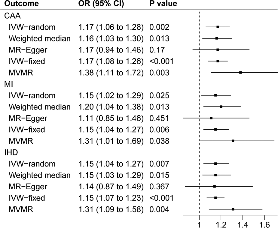 The scatter plots in Figure 2 showed that the SNP effect on CAA, MI, and IHD increased in correspondence with their effect on TIA. The results of the causal association between TIA and CADs are shown in Figure 3. In both the IVW fixed and random effect models in the univariable MR analysis, genetically predicted TIA was found to increase the risk of CAA, MI, and IHD (OR = 1.17, P < 0.05; OR = 1.15, P < 0.05; OR = 1.15, P < 0.05, respectively). In sensitivity analyses, the association between TIA and CADs remained consistent in the weighted median method (CAA: OR = 1.116, P = 0.013; MI: OR = 1.20, P = 0.013; IHD: OR = 1.15, P = 0.015, respectively). However, the associations were not significant in the MR-Egger analysis (P > 0.05). Further multivariable MR analysis adjusted for hypertension, diabetes, and smoking revealed consistent positive estimates for the associations between TIA and CADs (CAA: OR = 1.38, P = 0.003; MI: OR = 1.31, P = 0.038; IHD: OR = 1.31, P = 0.004, respectively).