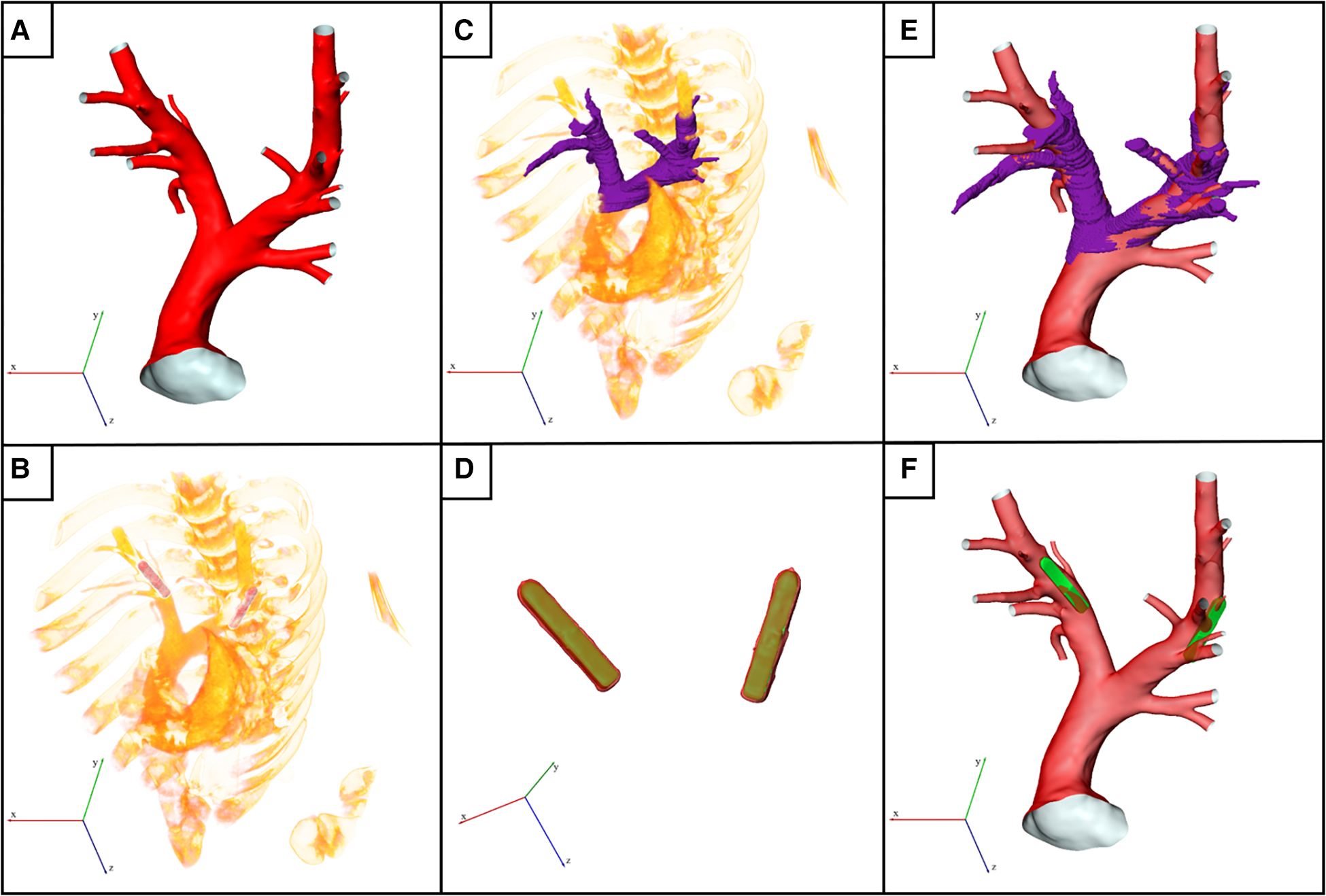 Illustration of the virtual device implantation procedure. (A) Reconstructed surface of an exemplary pulmonary artery (PA) acquired before pulmonary artery pressure sensor (PAPS) implantation. (B) Volume rendering of the post-interventional 3D computed tomography (CT) data showing both implanted PAPS. (C) Partial reconstruction of the post-interventional PA used for subsequent registration with pre-interventional dataset. (D) Reconstruction of both PAPS using high Hounsfield unit thresholds (red colored surface) was used to register the PAPS 3D model (green surface) to the exact post-interventional position. (E) Registered surfaces of pre- and post-interventional datasets. (F) Final geometry used for computational fluid dynamics simulation, generated by virtually implanting the PAPS.
