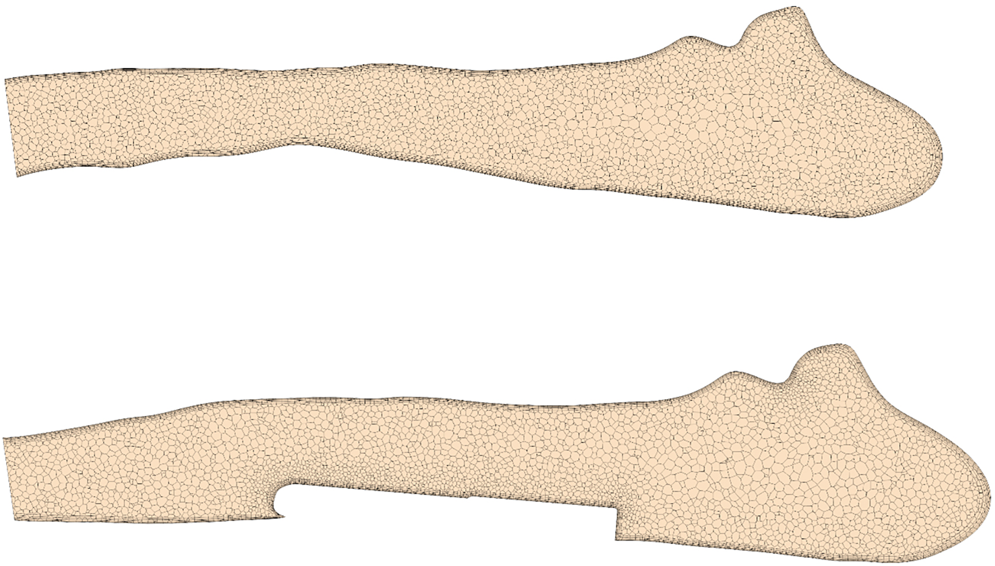Blood flow simulations were performed using STAR-CCM+ (15.04, Siemens PLM, Plano, Texas). The software provides both meshing algorithms to construct the computational mesh and finite-volume solvers for calculation of the intra-arterial hemodynamics. The fluid domain is discretized using polyhedral cells. In addition, six prism layers are introduced at at the vessel and sensor wall to resolve near-wall flows accurately. This information is required to accurately calculate hemodynamic parameters such as the wall shear stress (WSS, ) and the oscillating shear index (OSI). Exemplary cross-sections of the numerical meshes are shown in Figure 2 for a configuration with and without implanted sensor body.